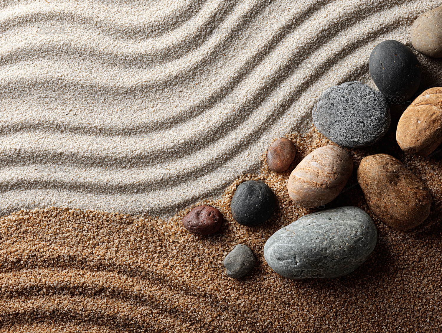 三个石头在白色的沙子上,禅思,平静,抽象的文化概念,鹅卵石和沙子以及有规律的线条