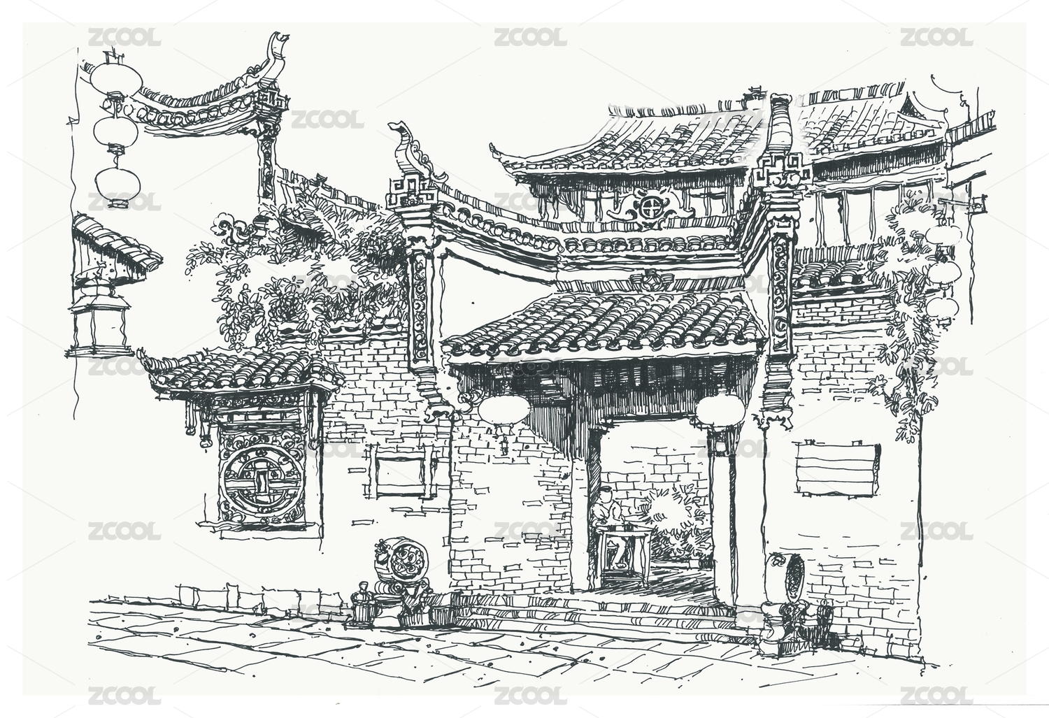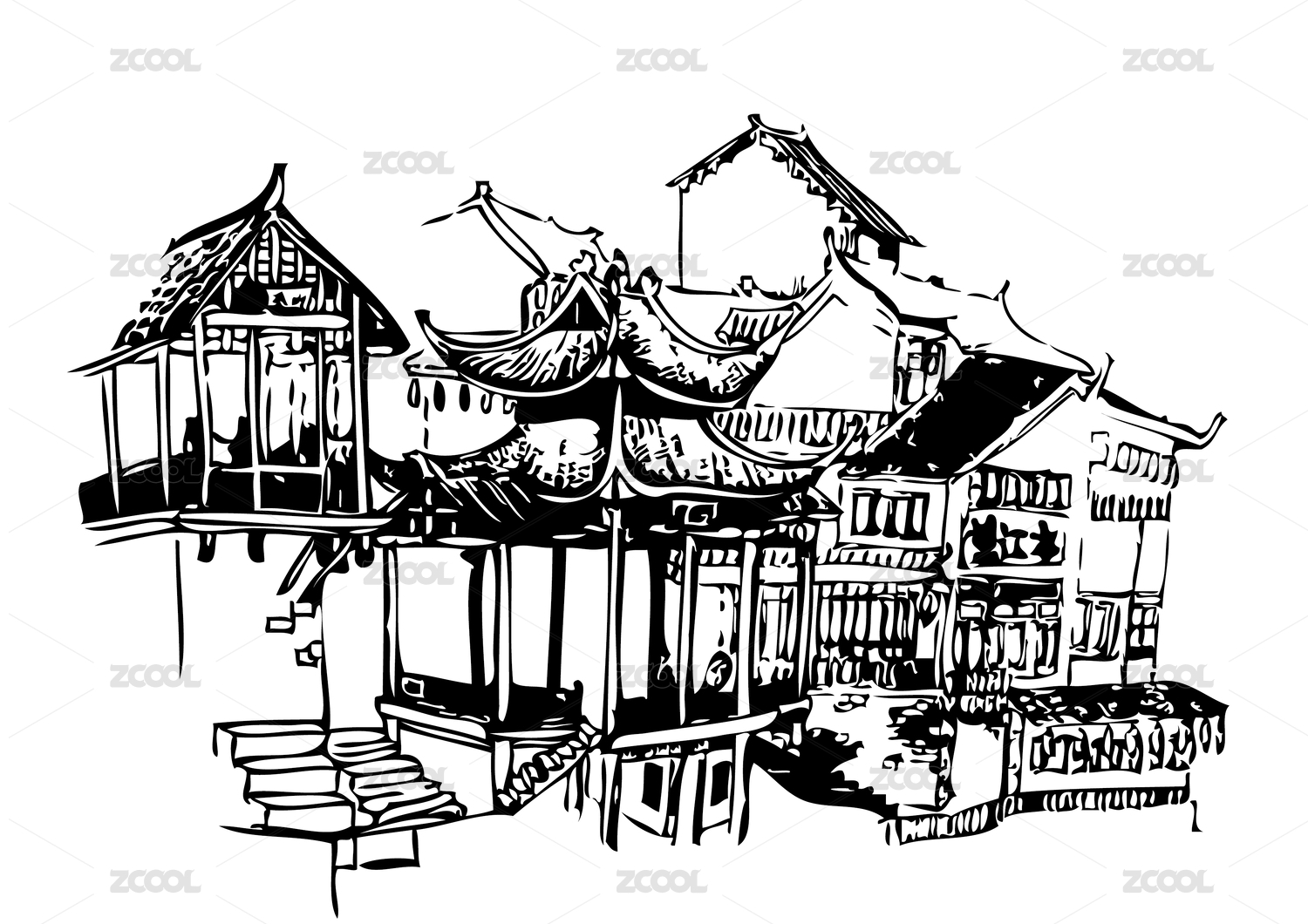 中国古镇 宏村 手绘 画 钢笔速写 水乡 蜡染 矢量