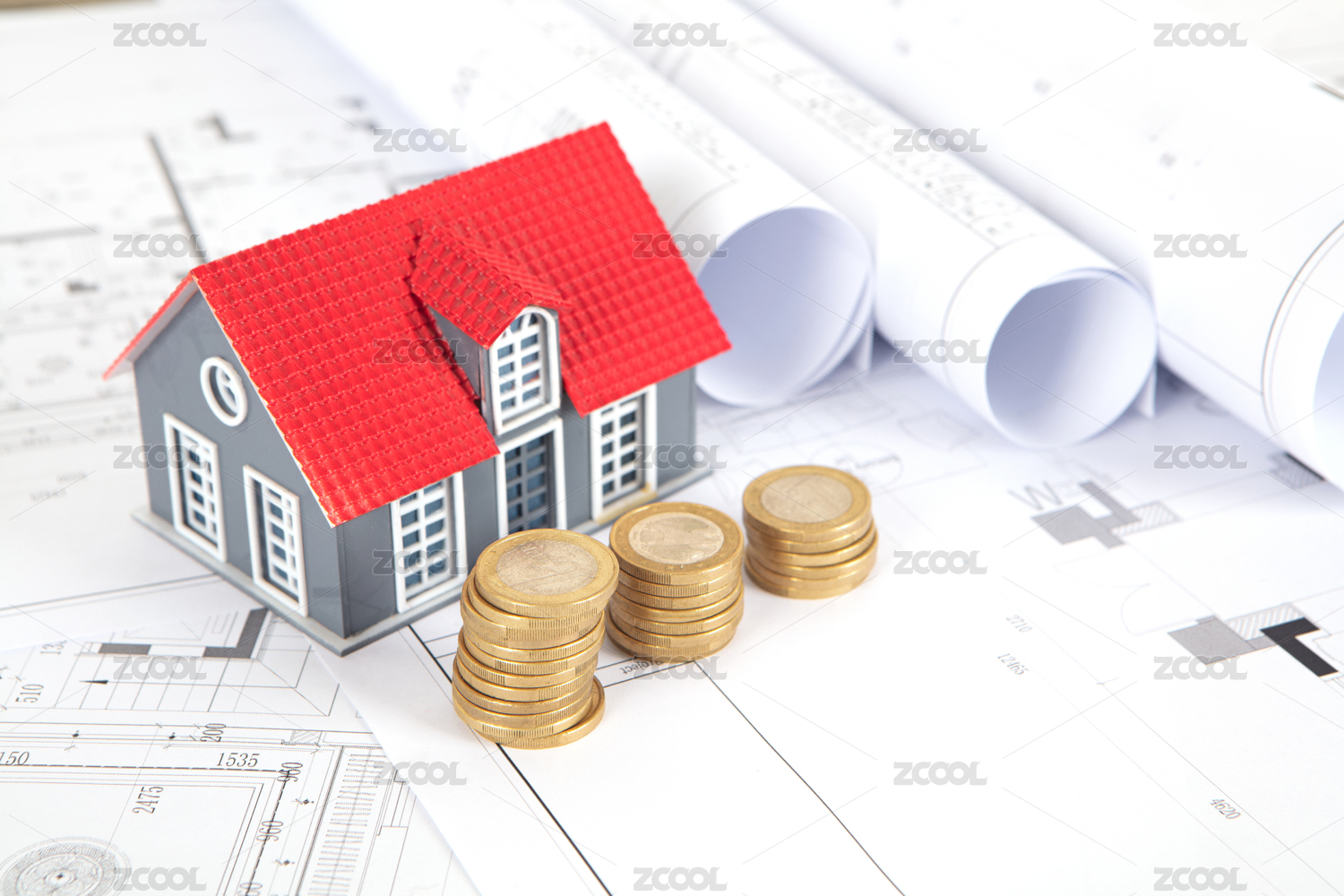 桌子上的图纸和图纸上的小房子模型及一排欧元硬币和相关工具