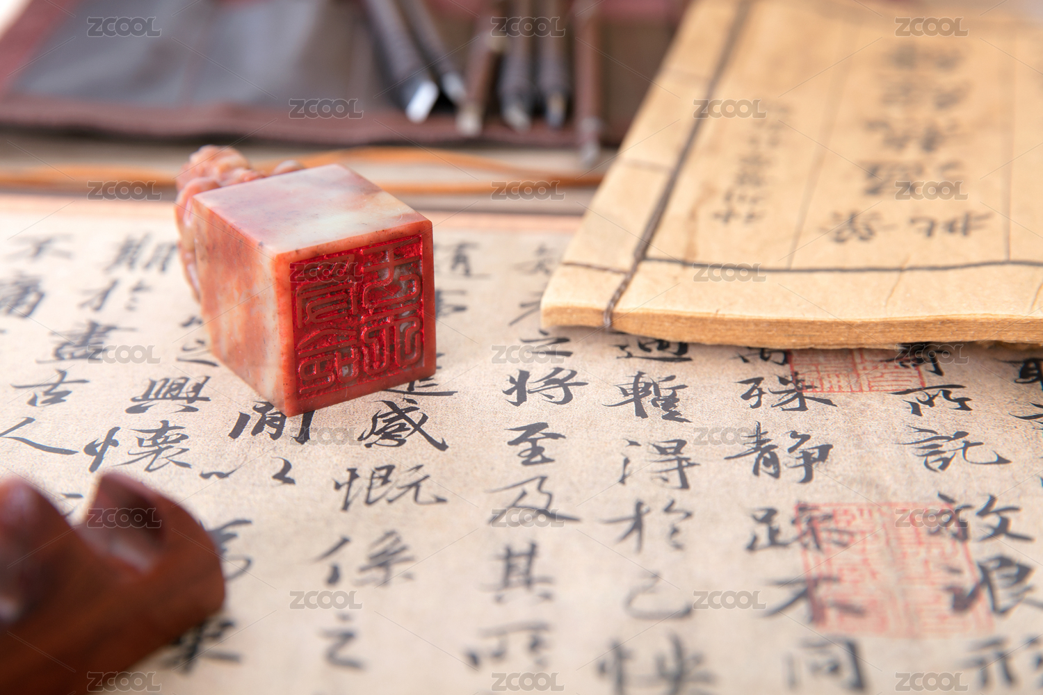 翻开的书籍和上面的毛笔及印章