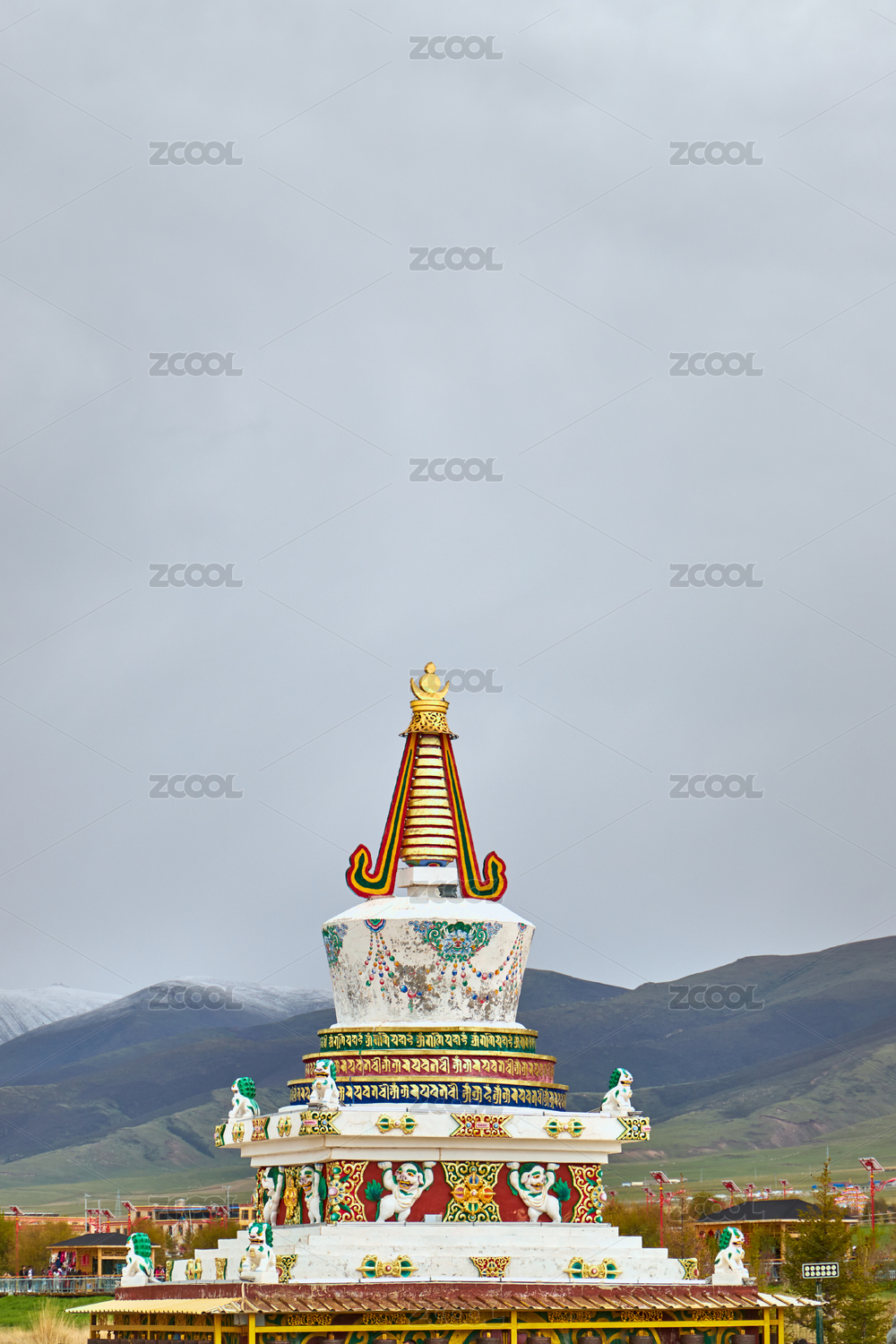 天空下青海省湟中塔尔寺入口处的的白色菩提塔