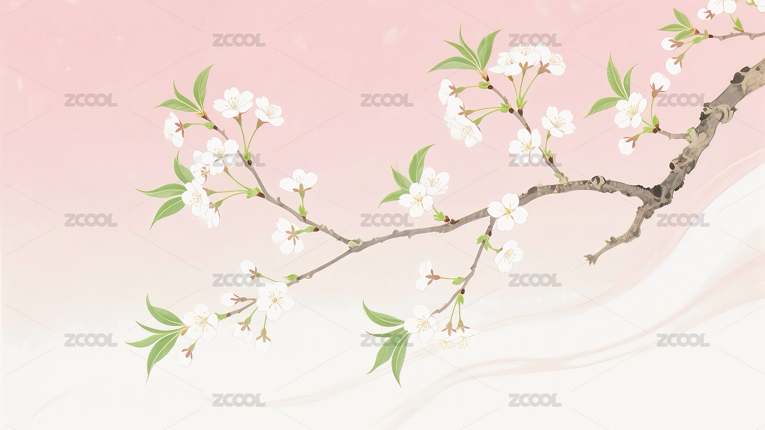 蓝天中红梅映雪花瓣纷飞-冬季美景插画