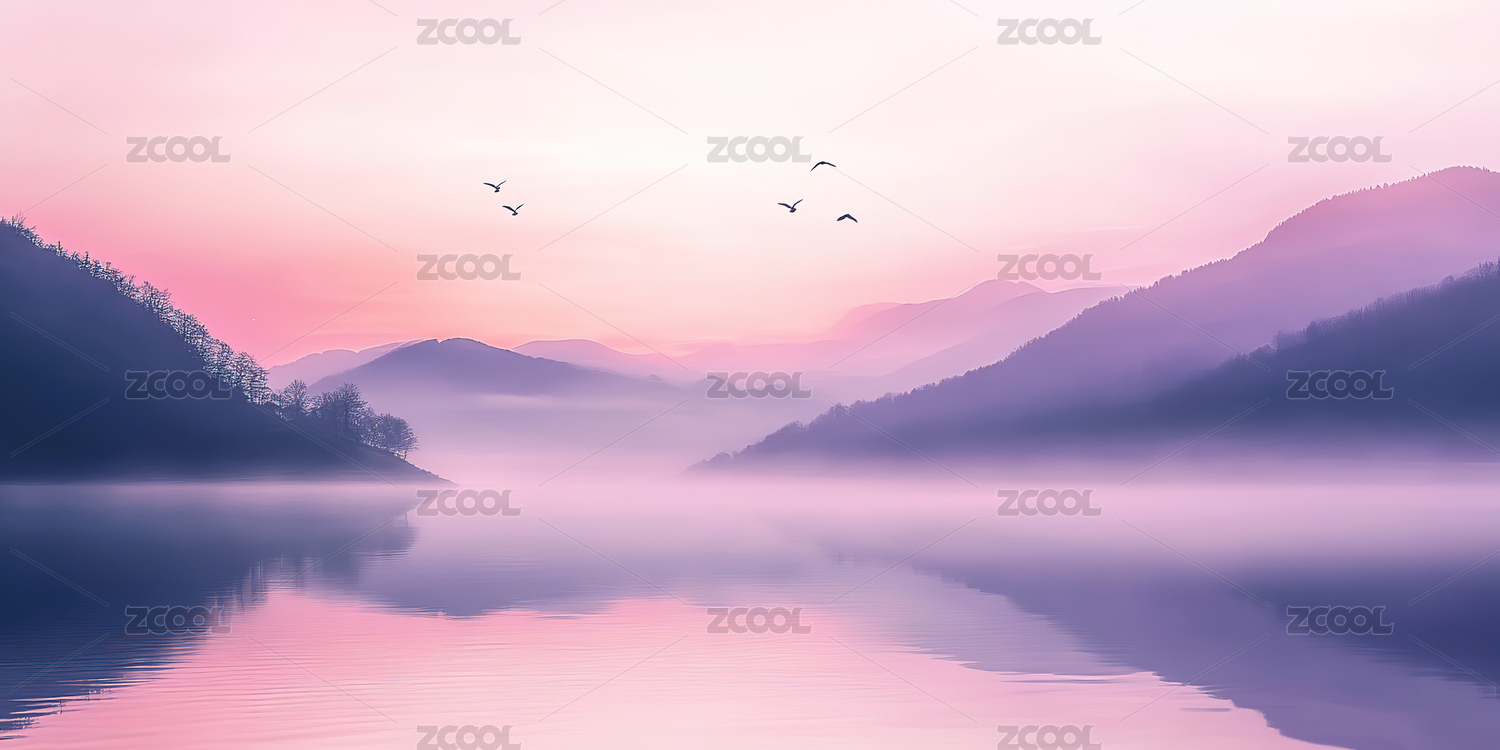 夕阳下湖面上的鸟儿在天空中飞翔的剪影