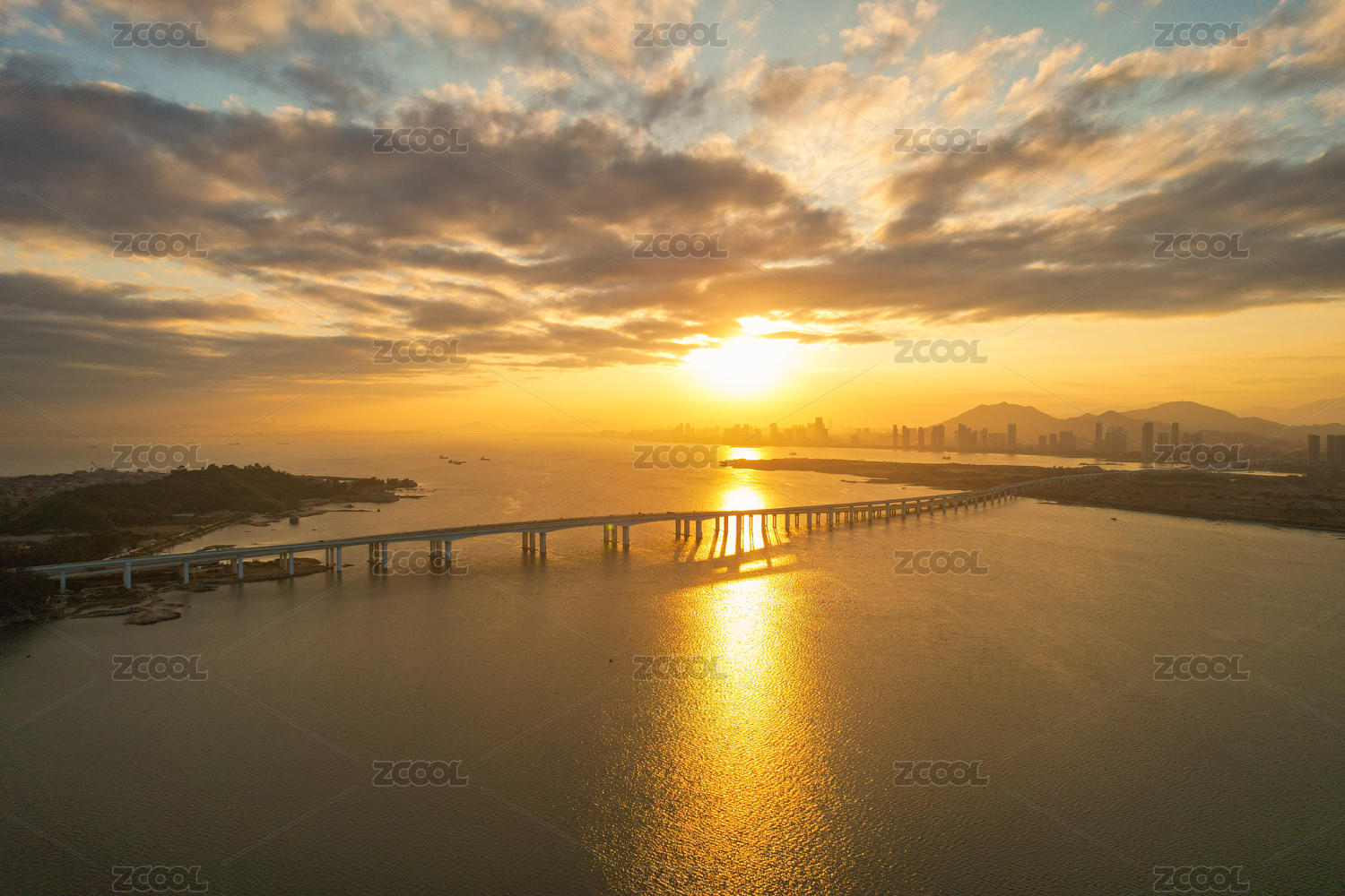 清晨朝霞中的澳门西湾大桥与澳门塔航拍
