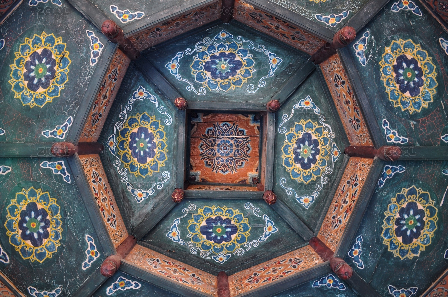 仰视亭子顶部的装饰绘画