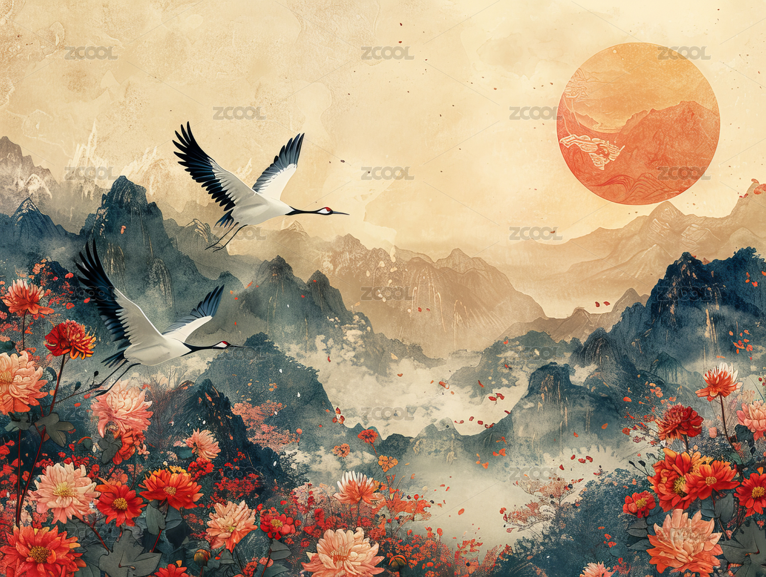 重阳节主题背景仙鹤丹顶鹤中国风国画工笔画