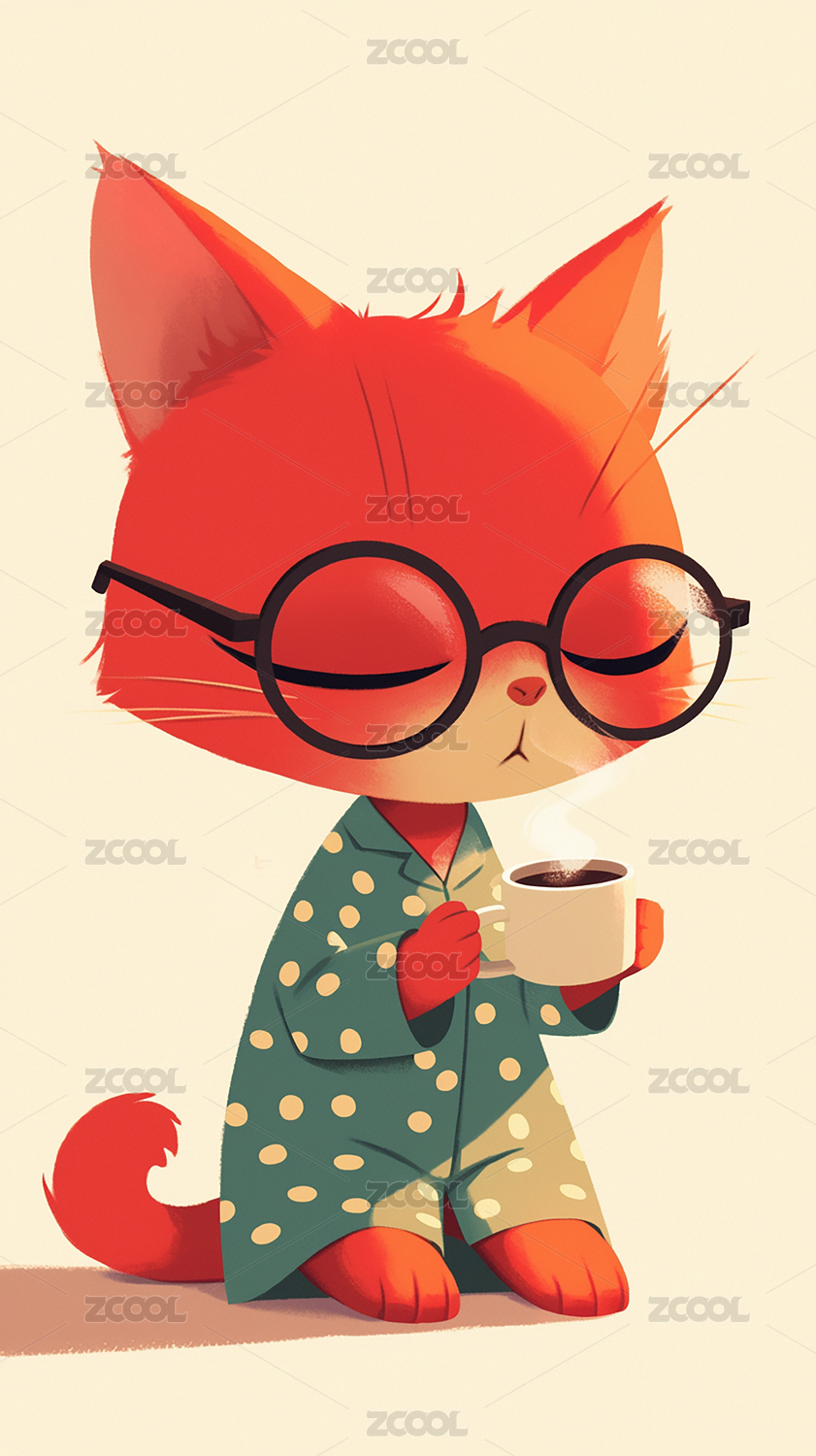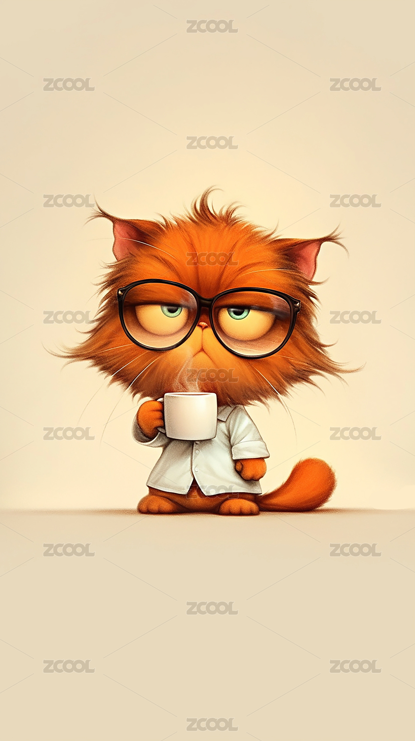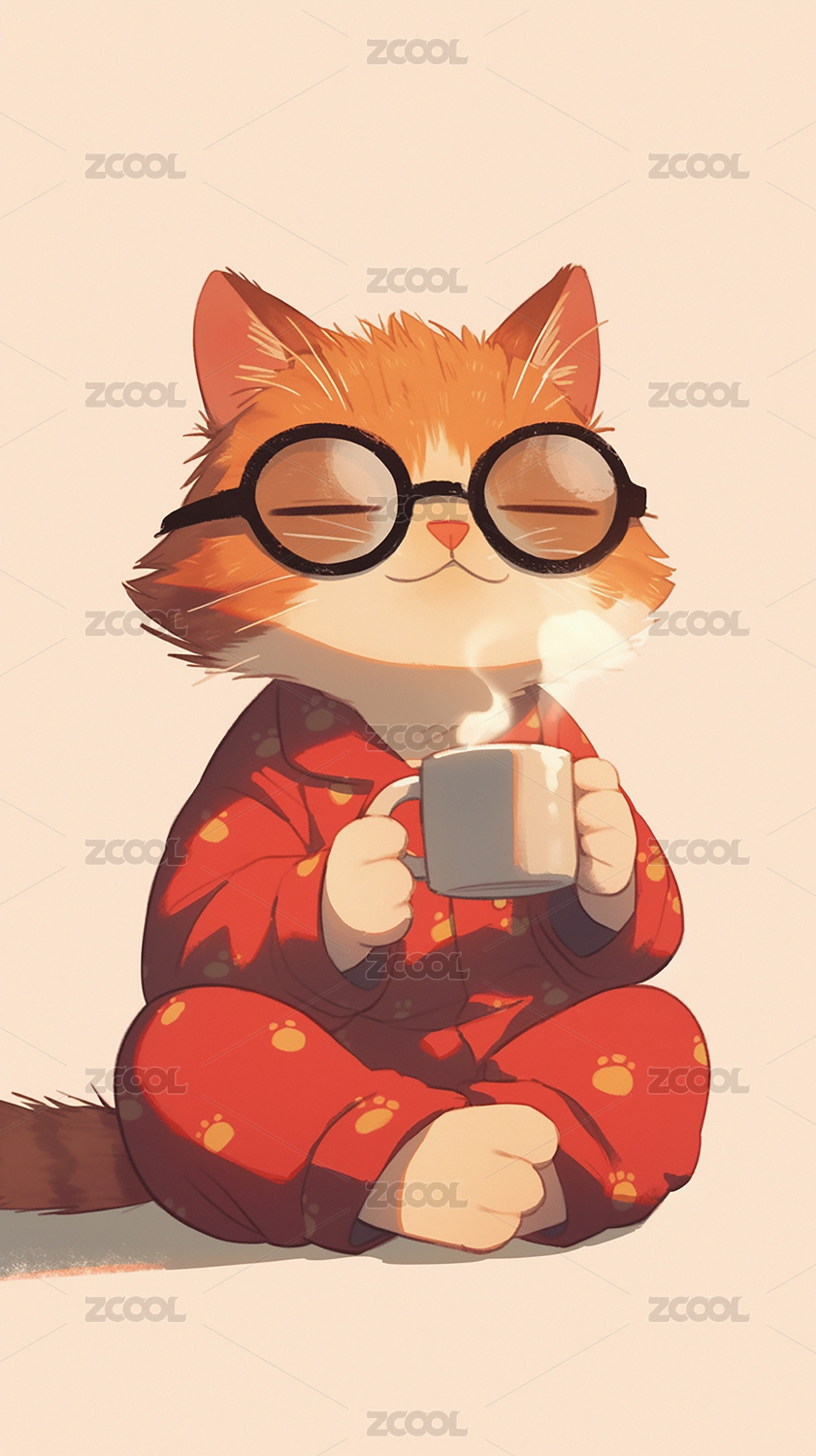 复古风格时尚惬意戴着墨镜喝咖啡的小猫咪