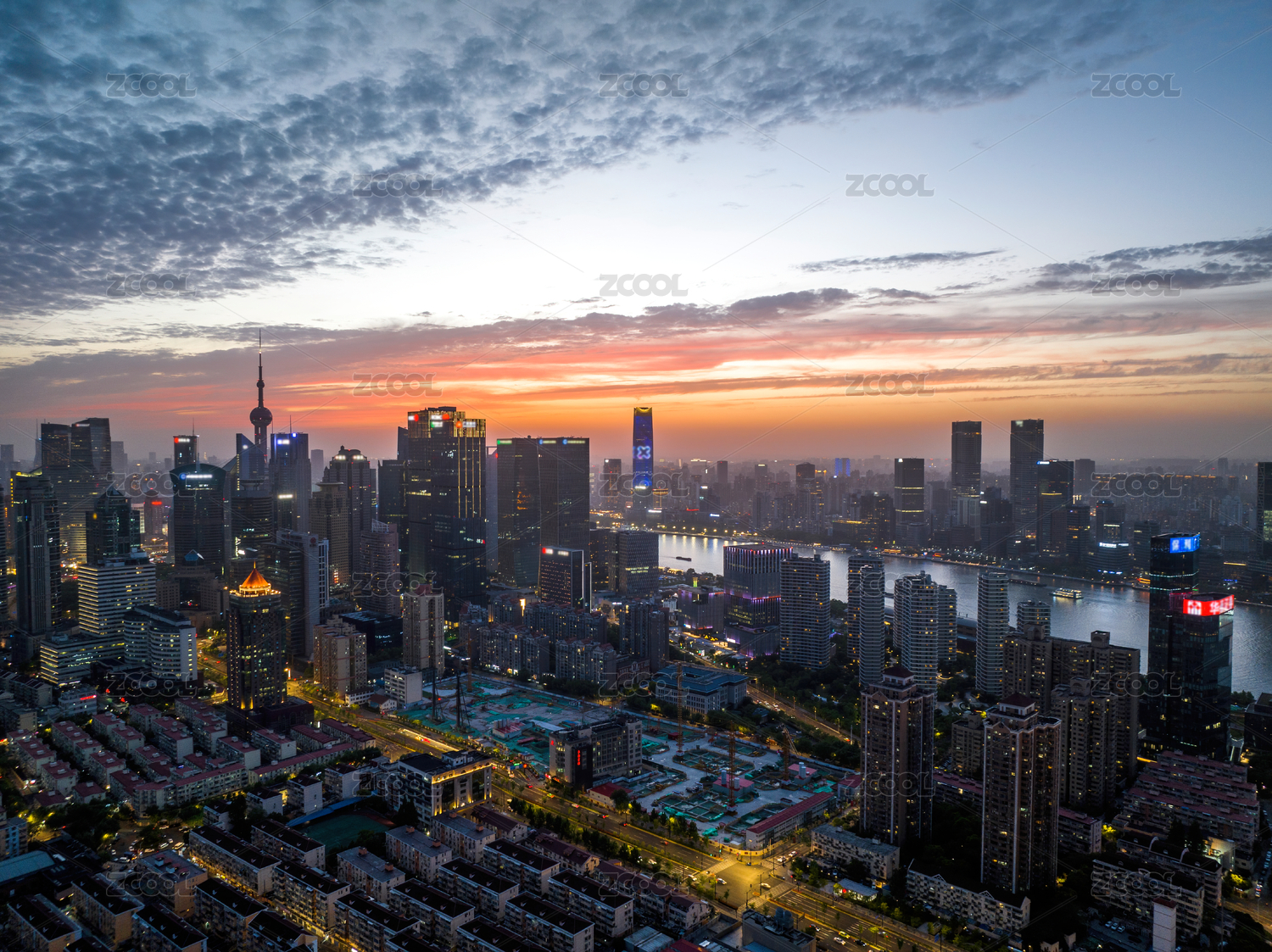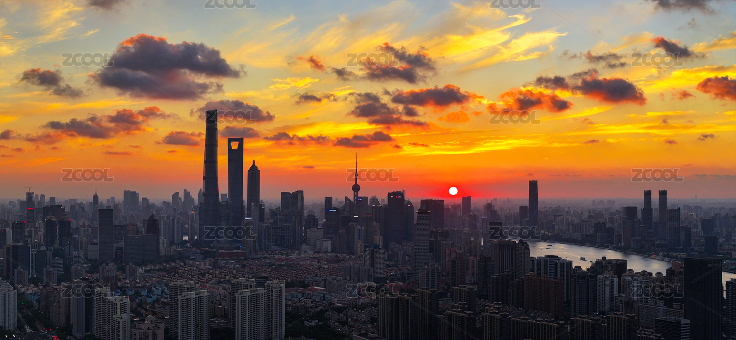 中国上海城市陆家嘴晚霞城市风光航拍