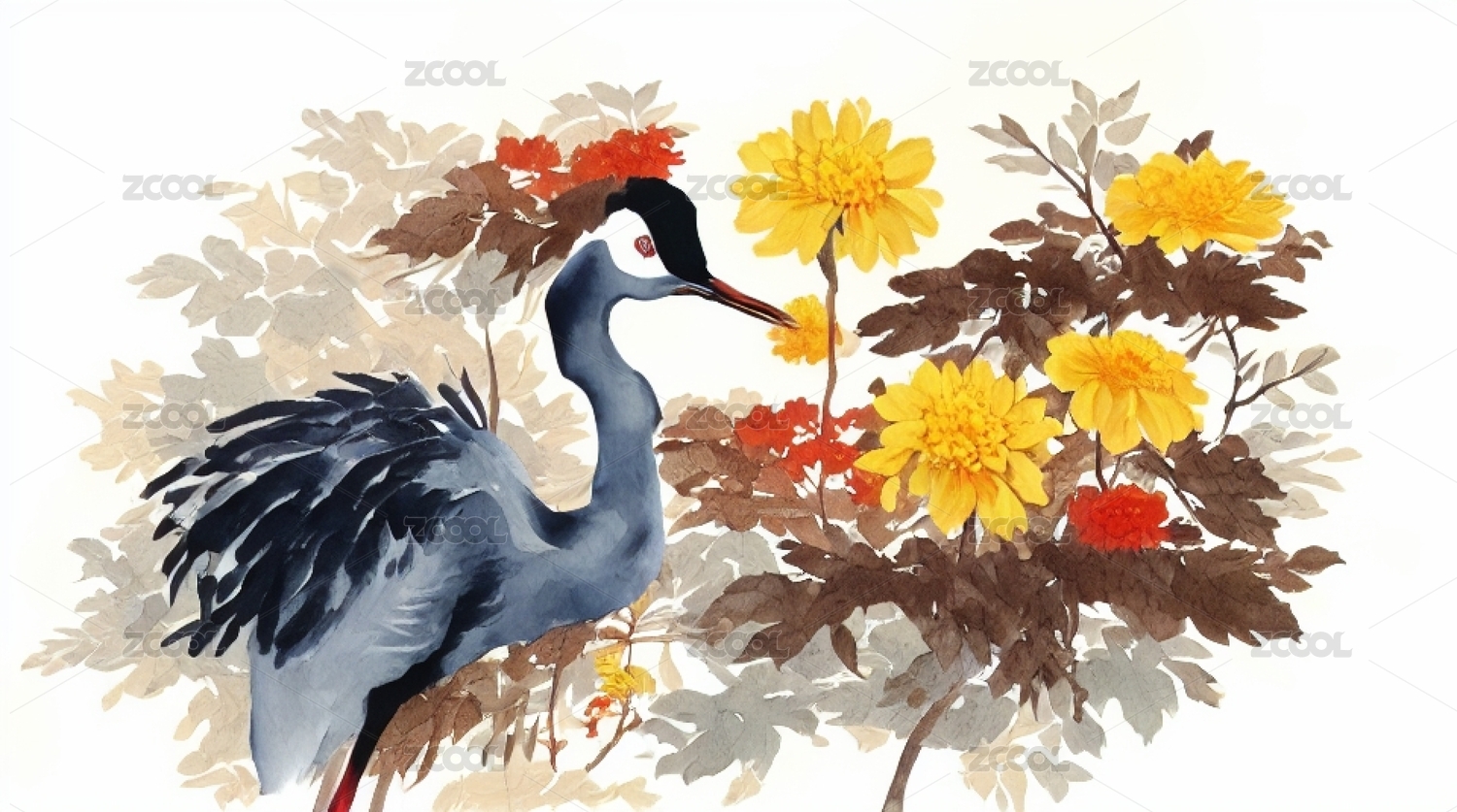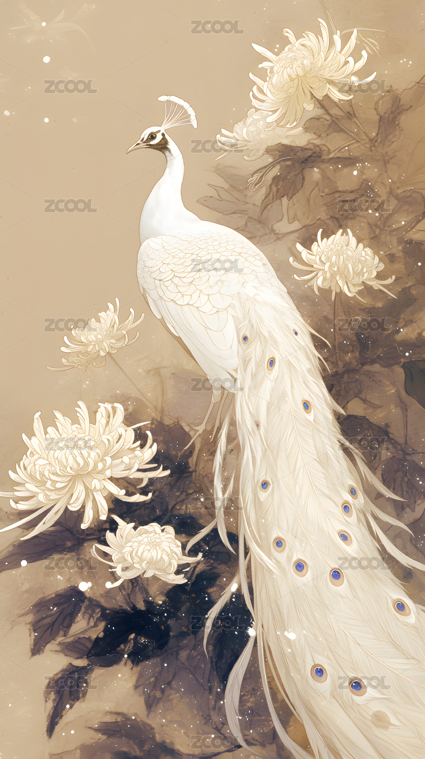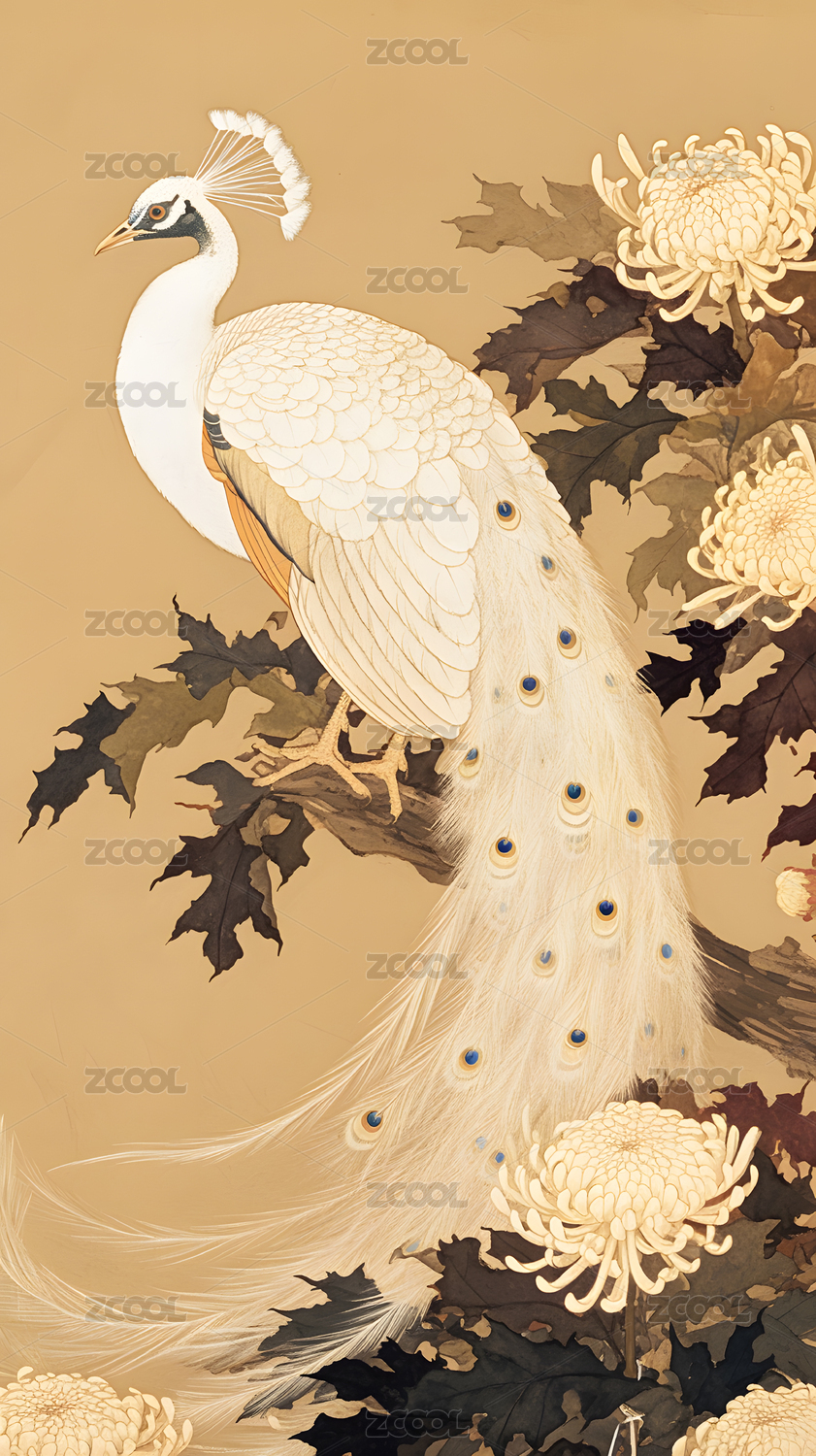 AIGCFG01,插画,孔雀,白孔雀,菊花,浮世绘,水墨画
