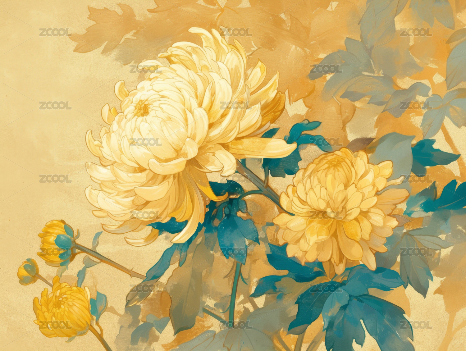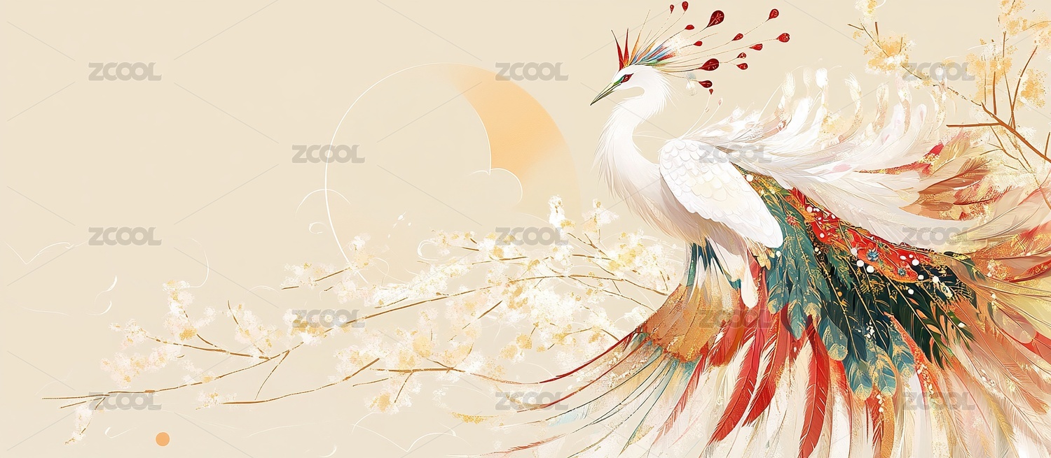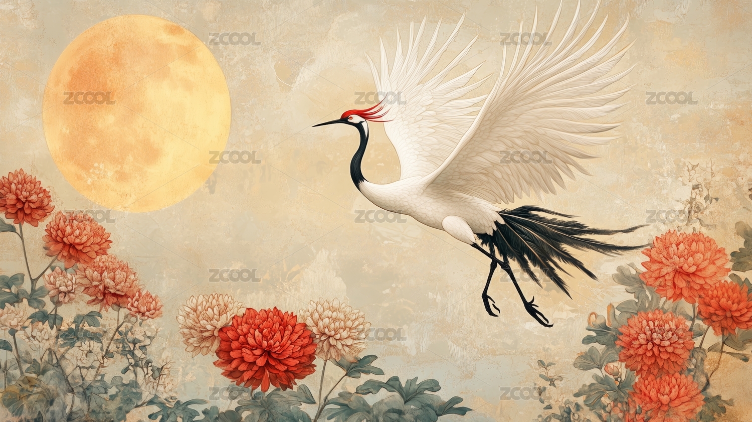AIGCFG01,插画,孔雀,白孔雀,菊花,浮世绘,水墨画