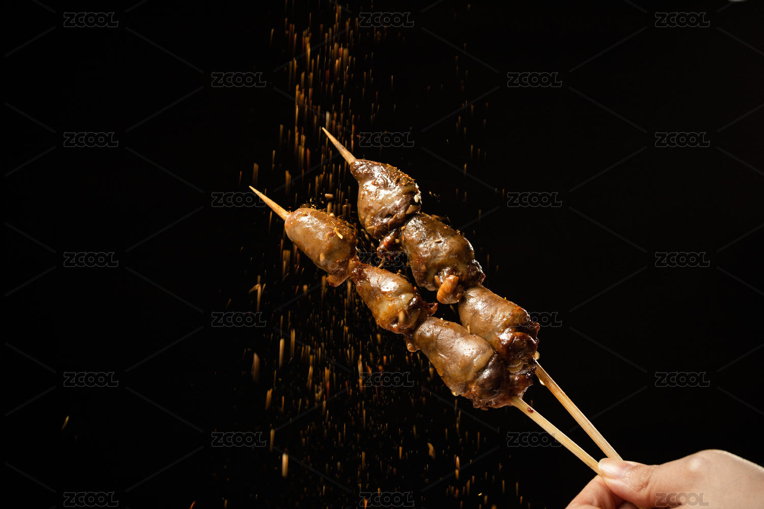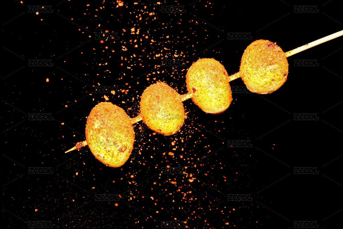 洒辣椒面的烧烤竹签串着的麻辣烤串烤土豆