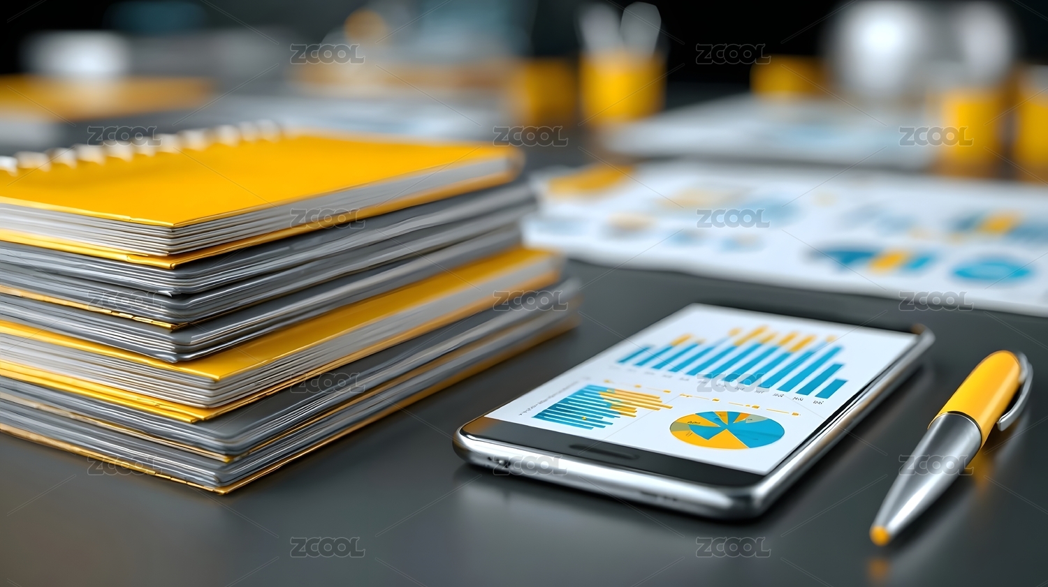 办公桌面数据图表与文具特写