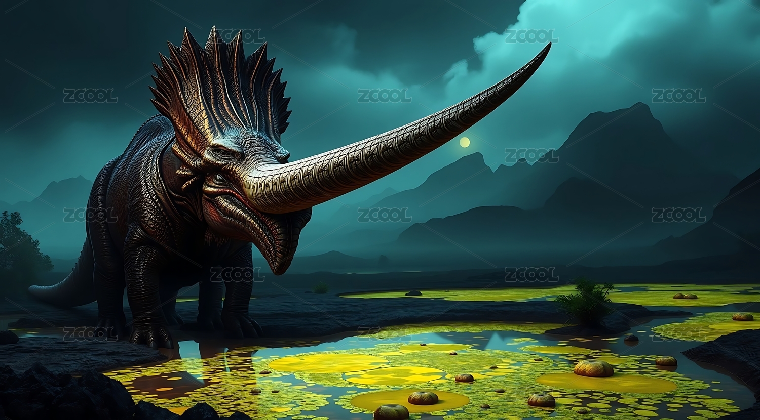 三角龙, 恐龙, 树木, 森林, 动物, 巨型, 自然, 生态, 奇幻, 远古