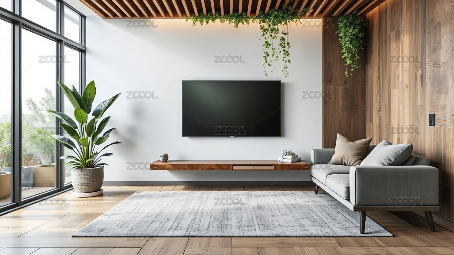 灰墙木地板房间有电视绿植显简约