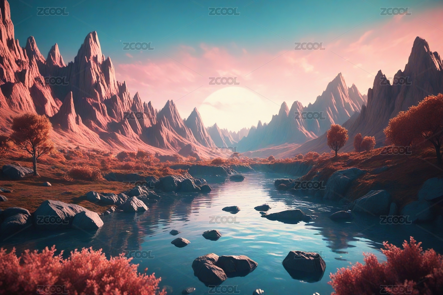 3D山地湖泊插画