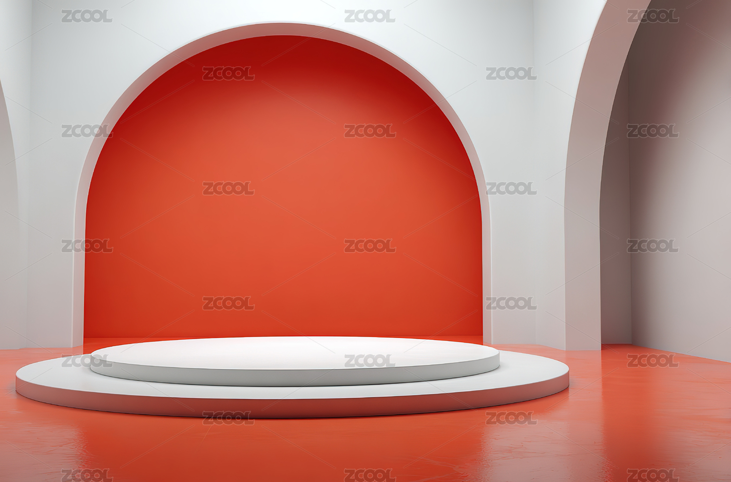 红色拱门内的白色圆形展台