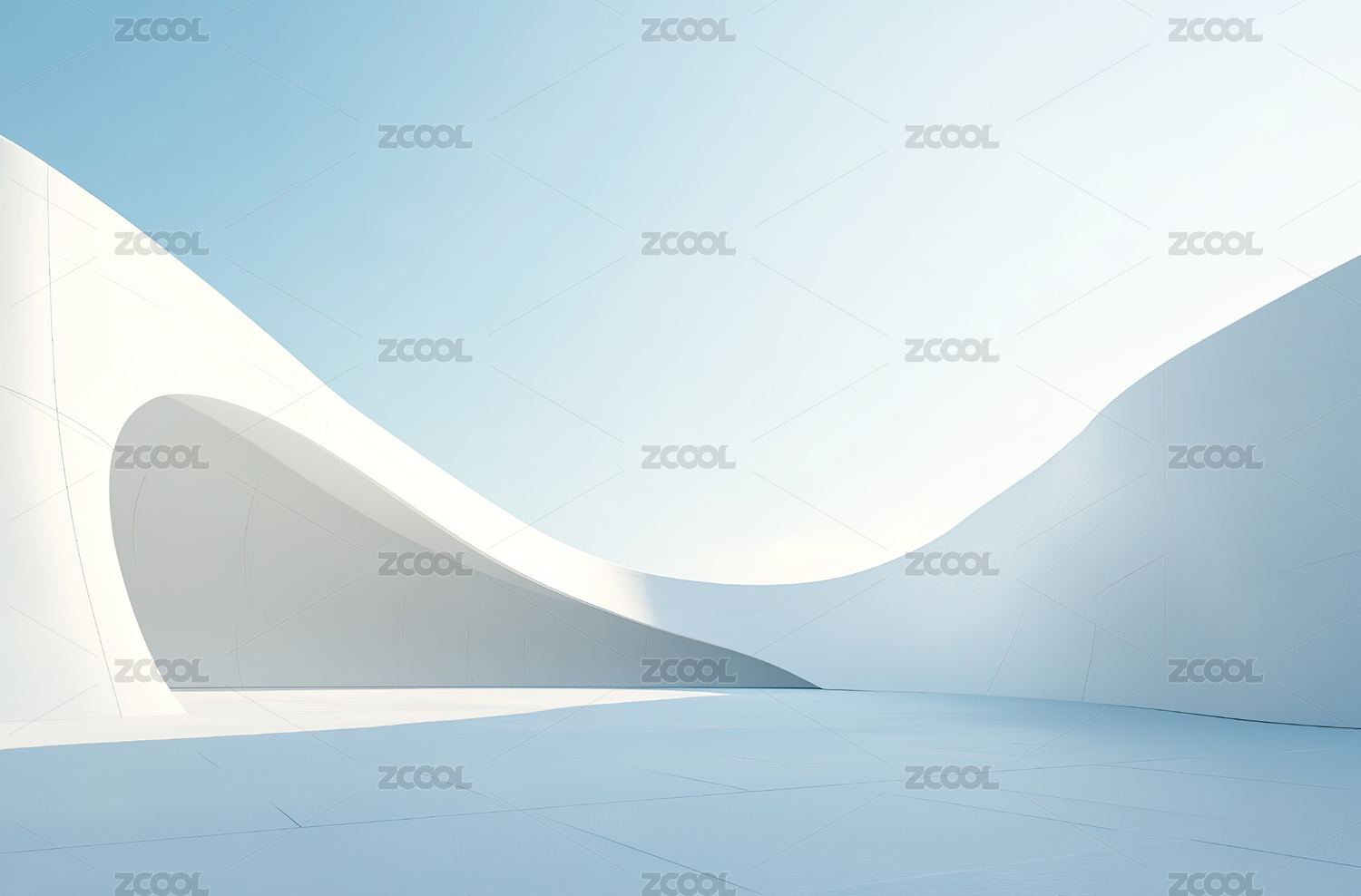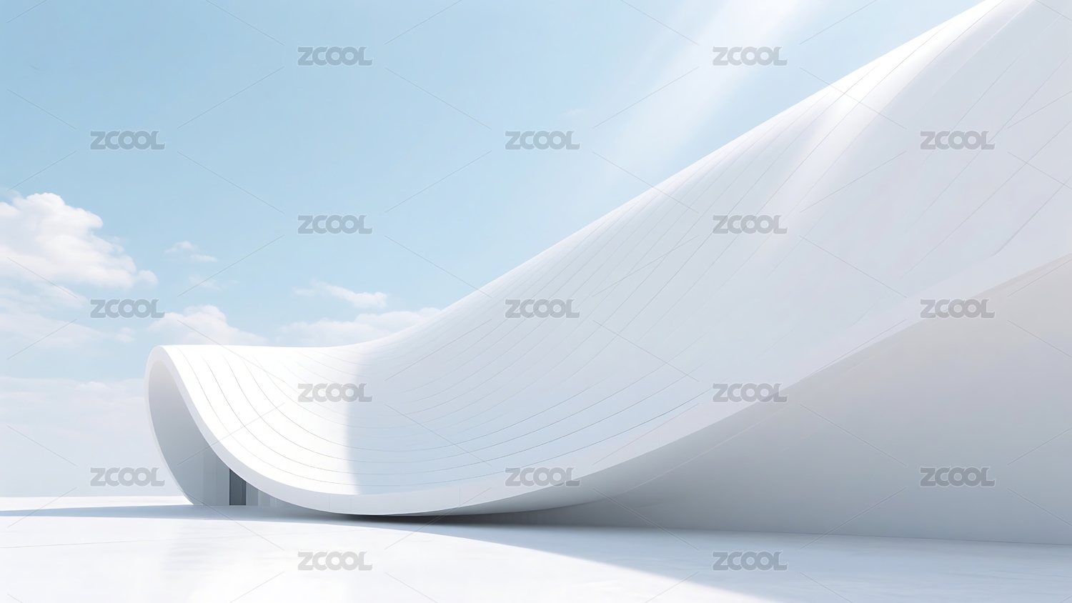 无人广场白色弯曲弧形建筑与倒影有天空背景