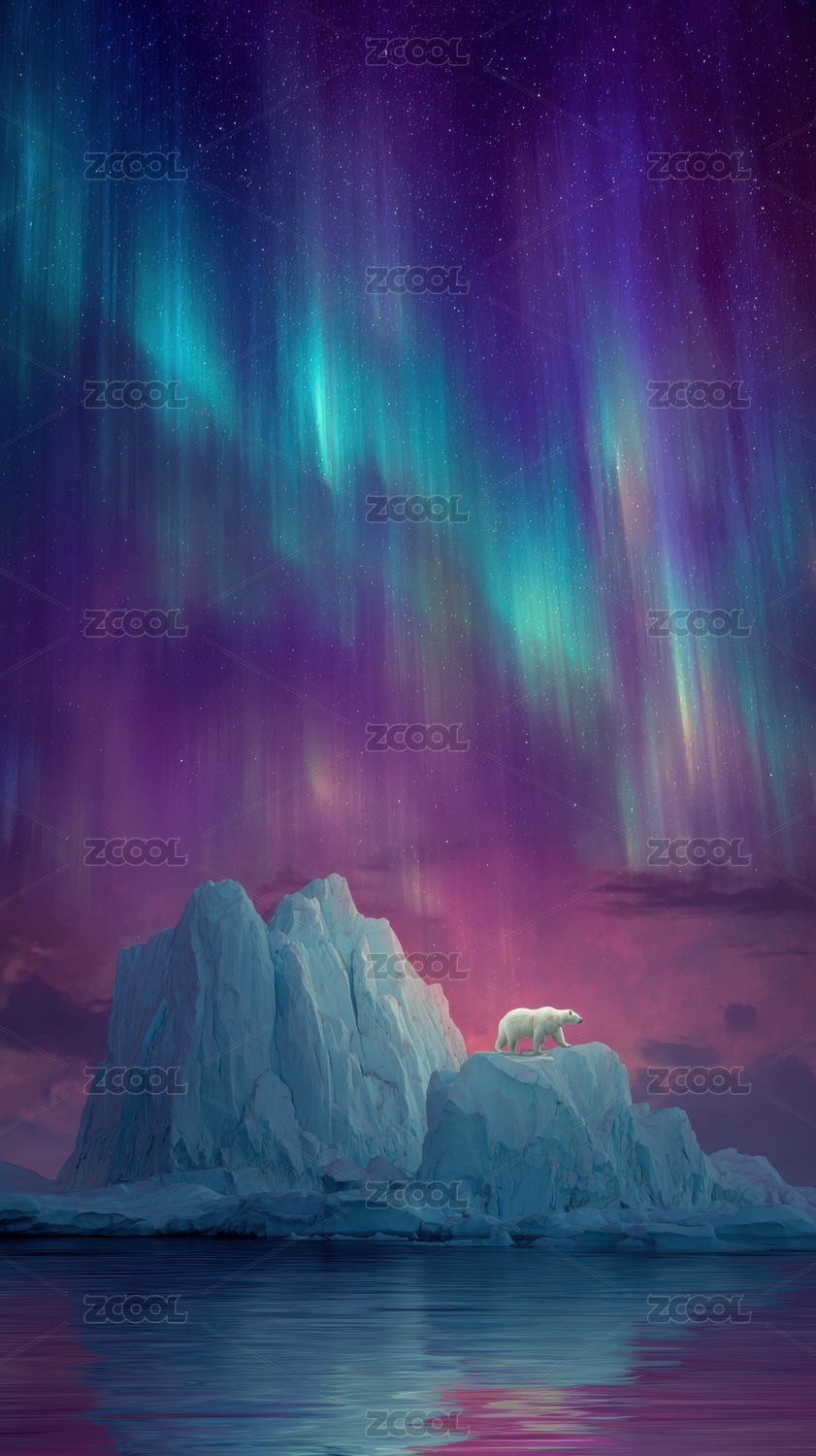 极光下的冰山与北极熊