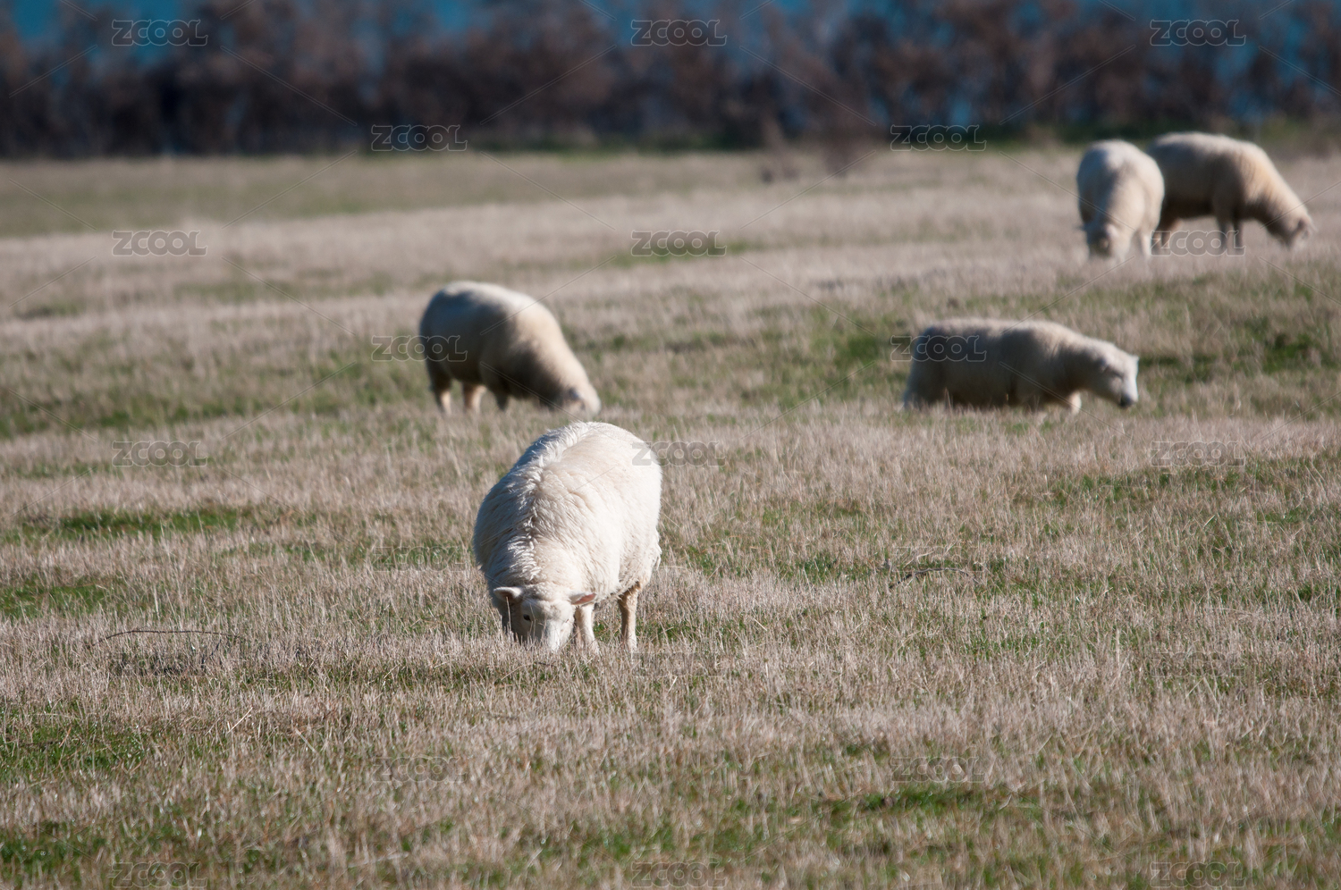 新西兰瓦湖边牧场上正在吃草的绵羊