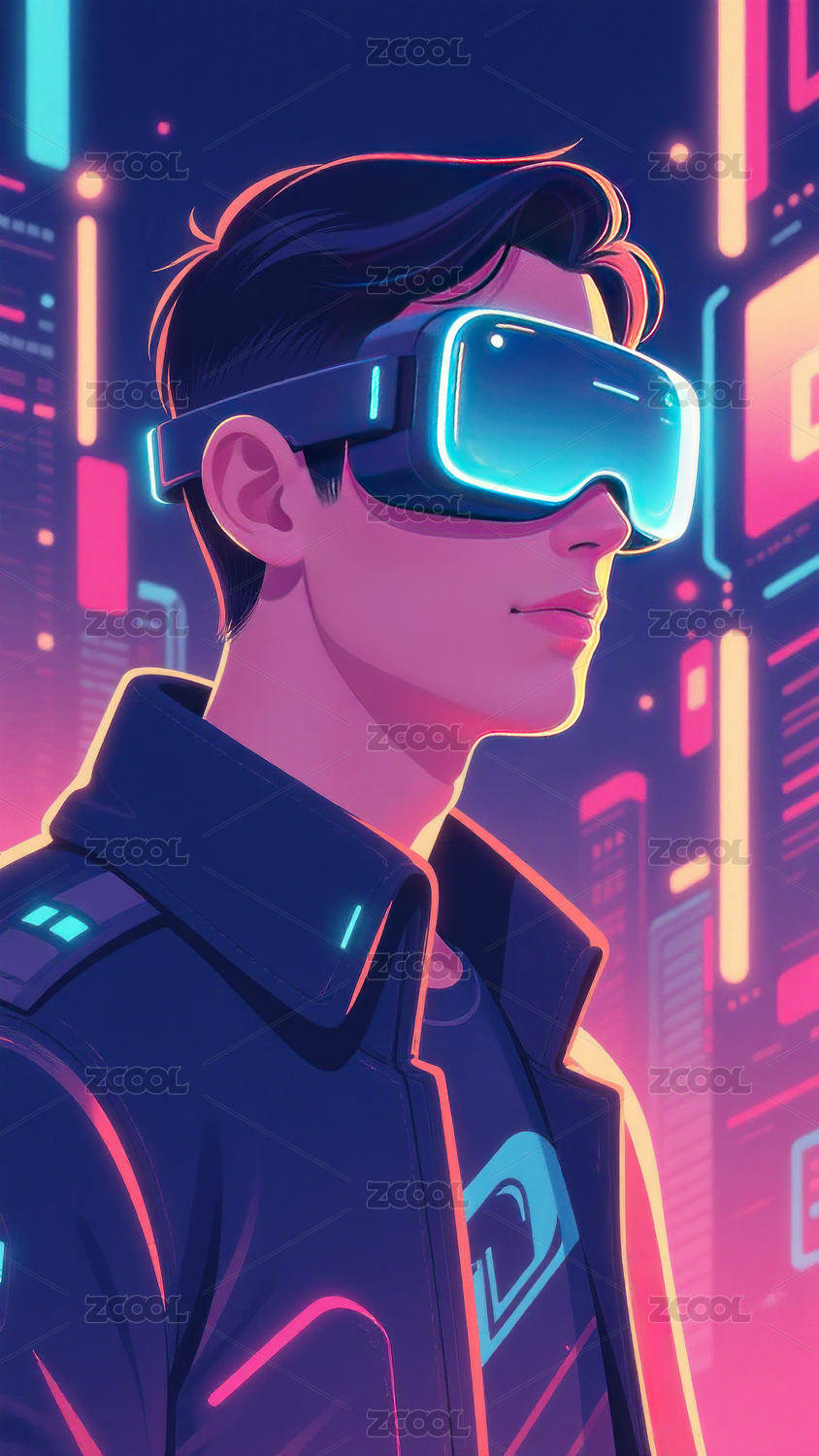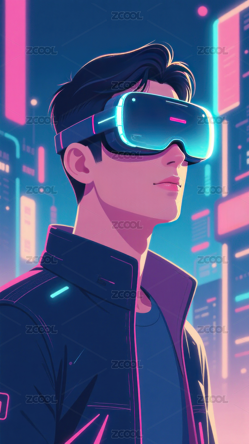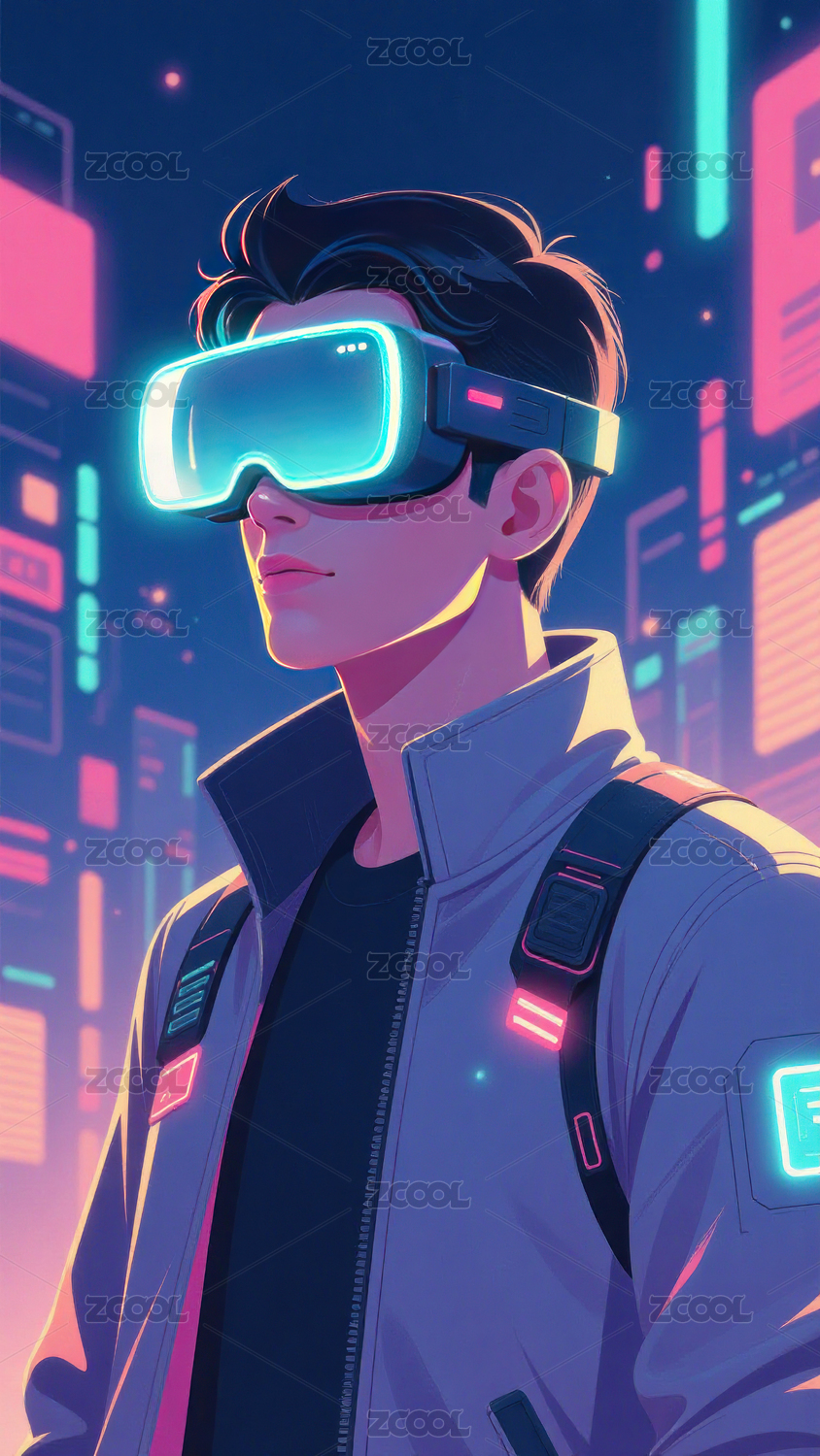 穿冲锋衣的男性戴着VR眼镜赛博朋克插画