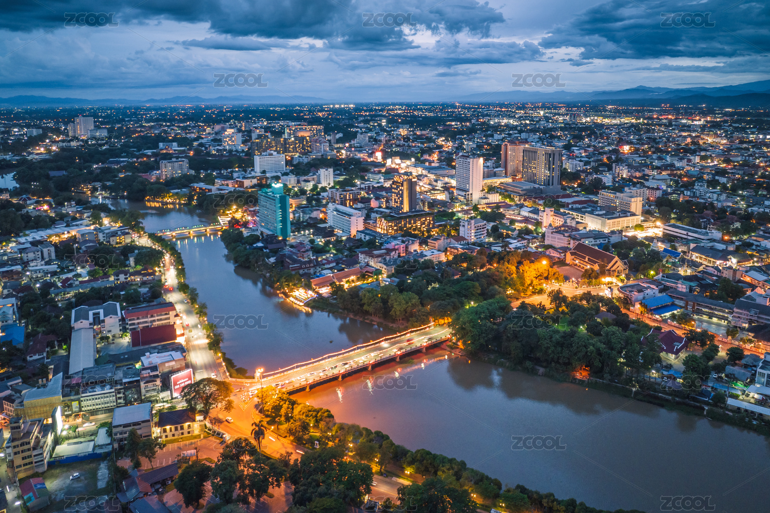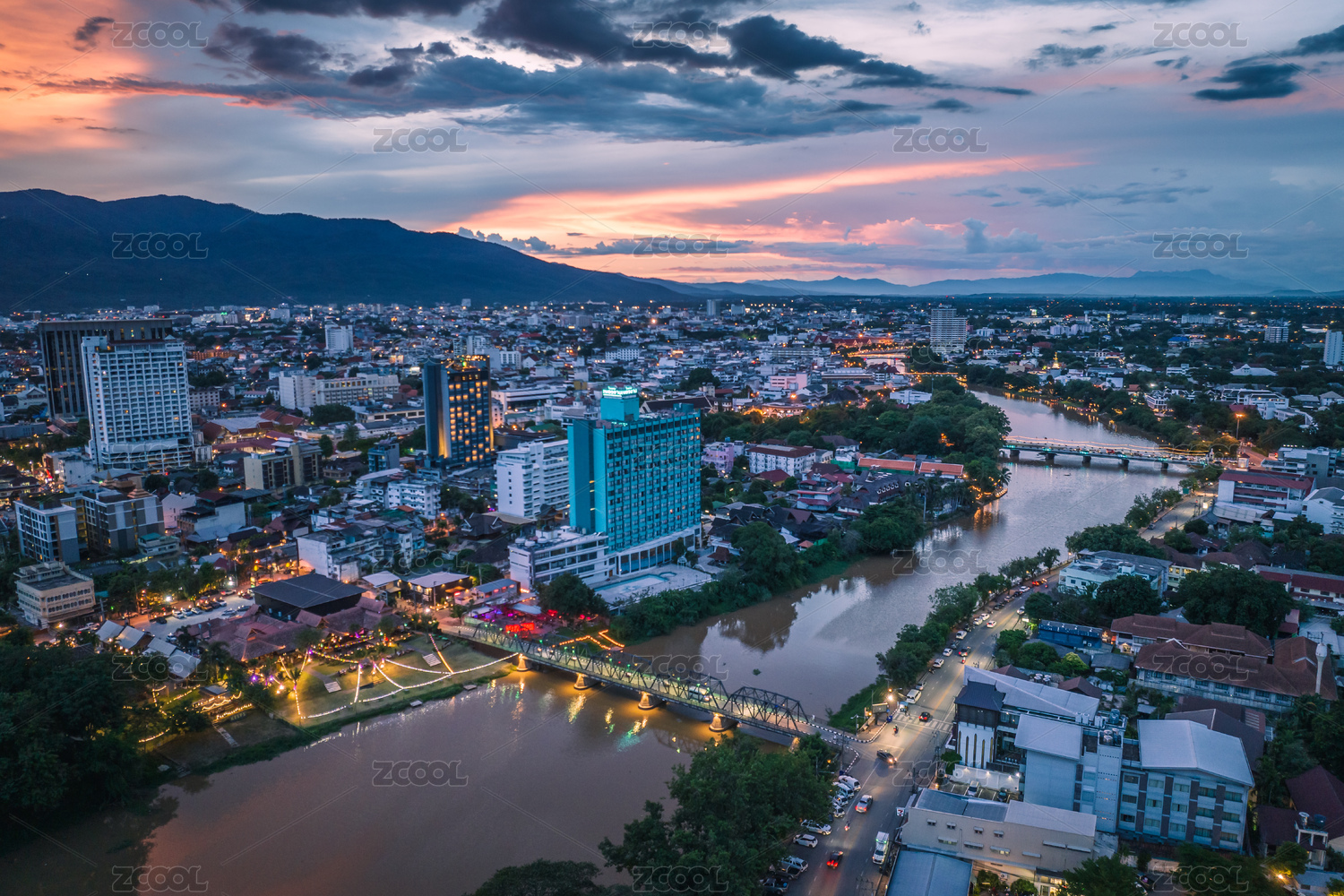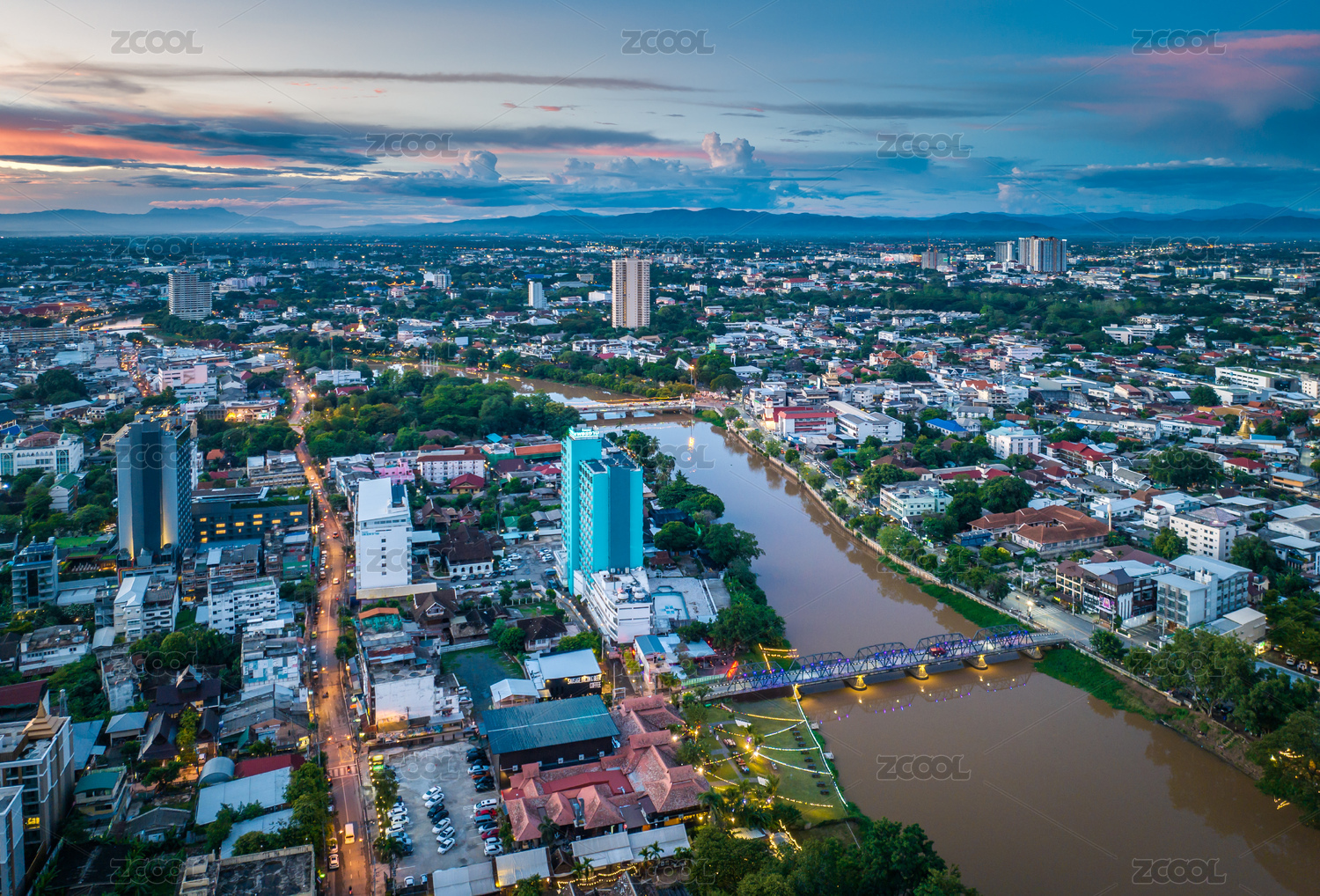 航拍泰国清迈湄平河新城城市建筑天际线晚霞
