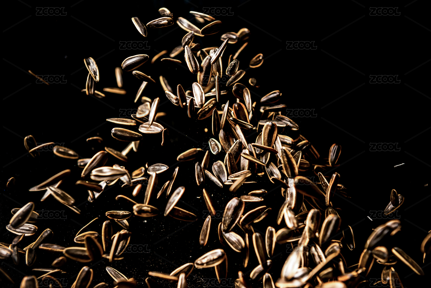 零食葵瓜子掉落黑色背景瞬间高速棚拍