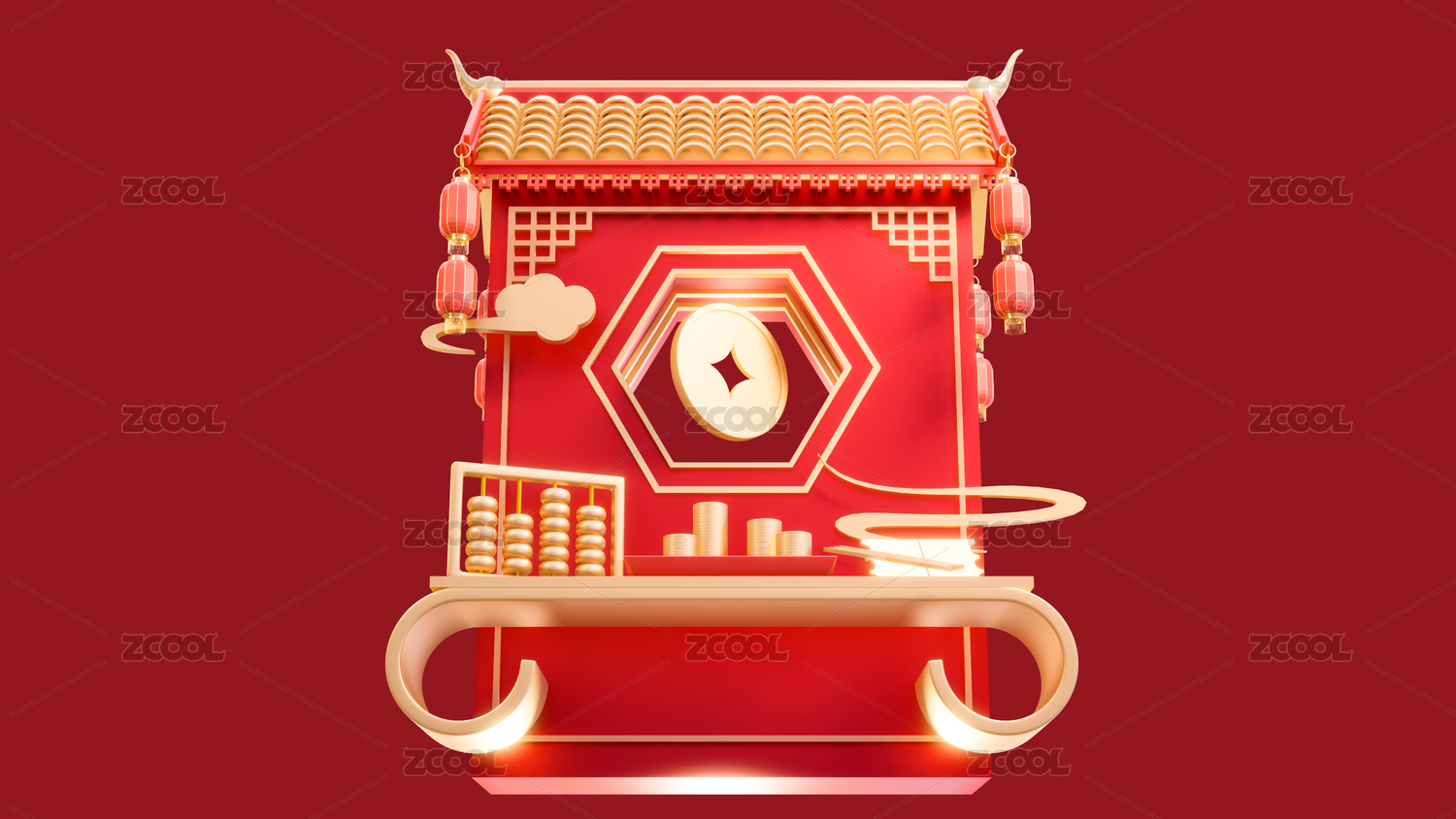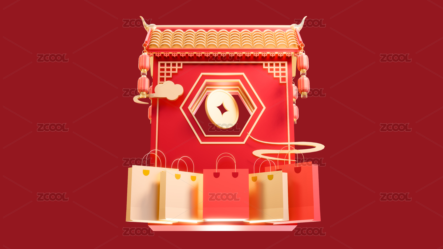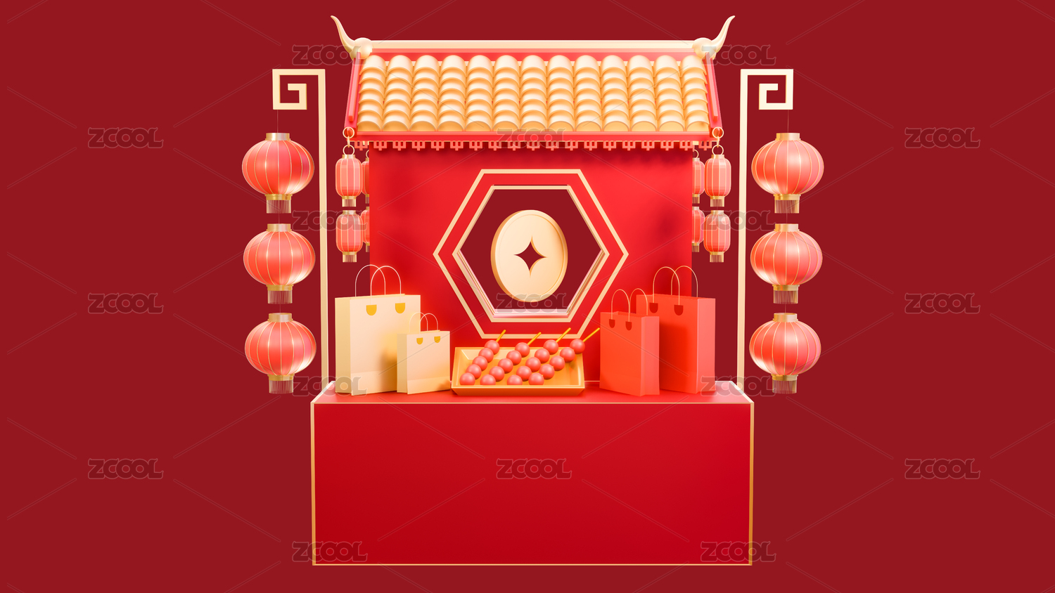 3d中式年货节春节集市摊喜庆场景元素插画
