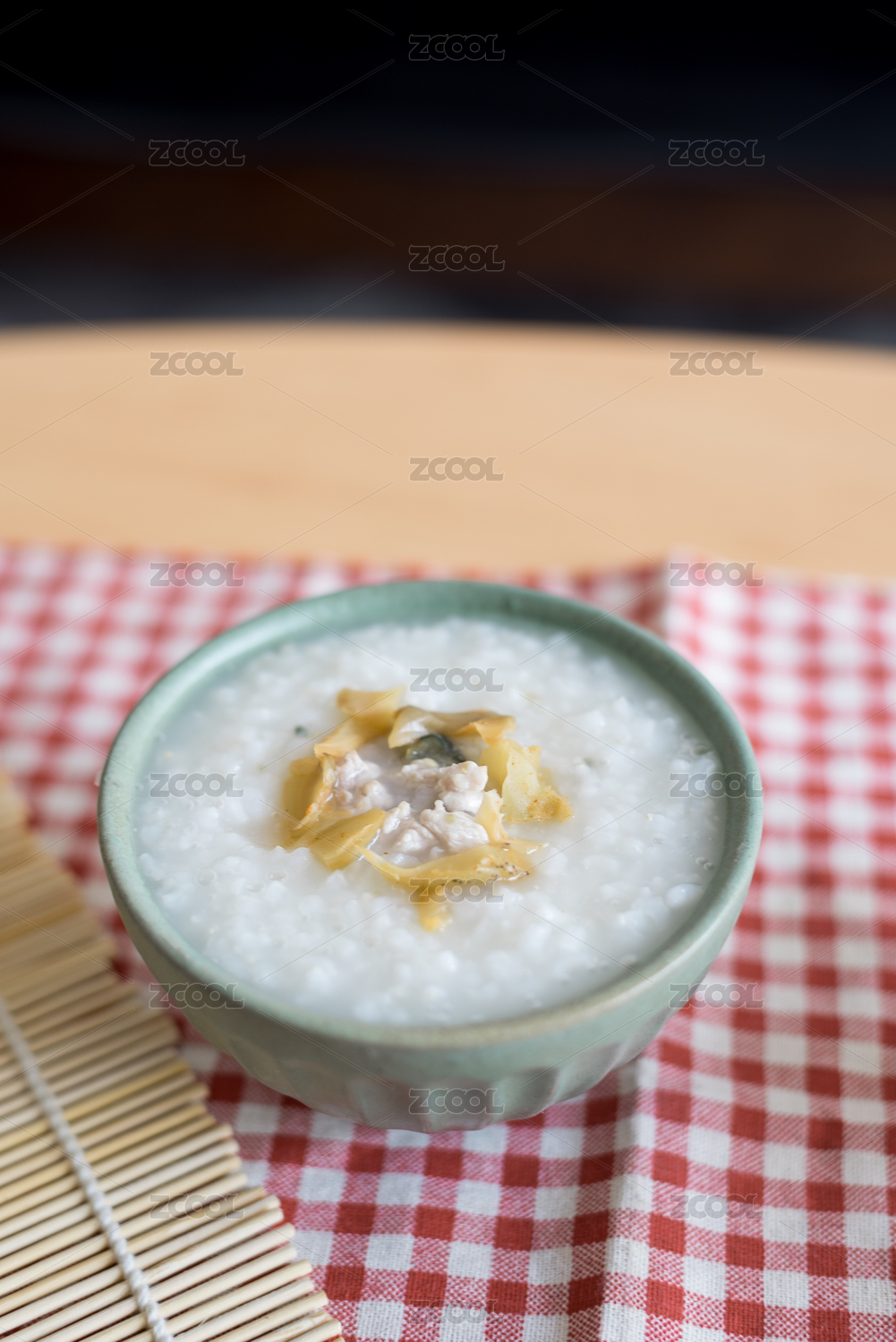 红褐色木板桌面上的一碗皮蛋瘦肉粥和碗托