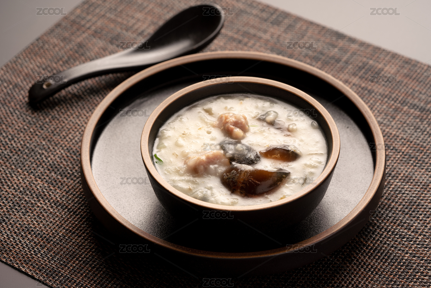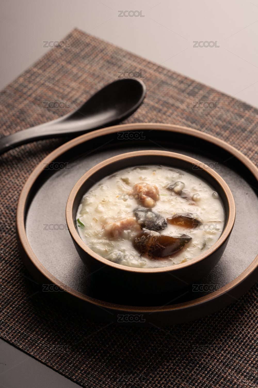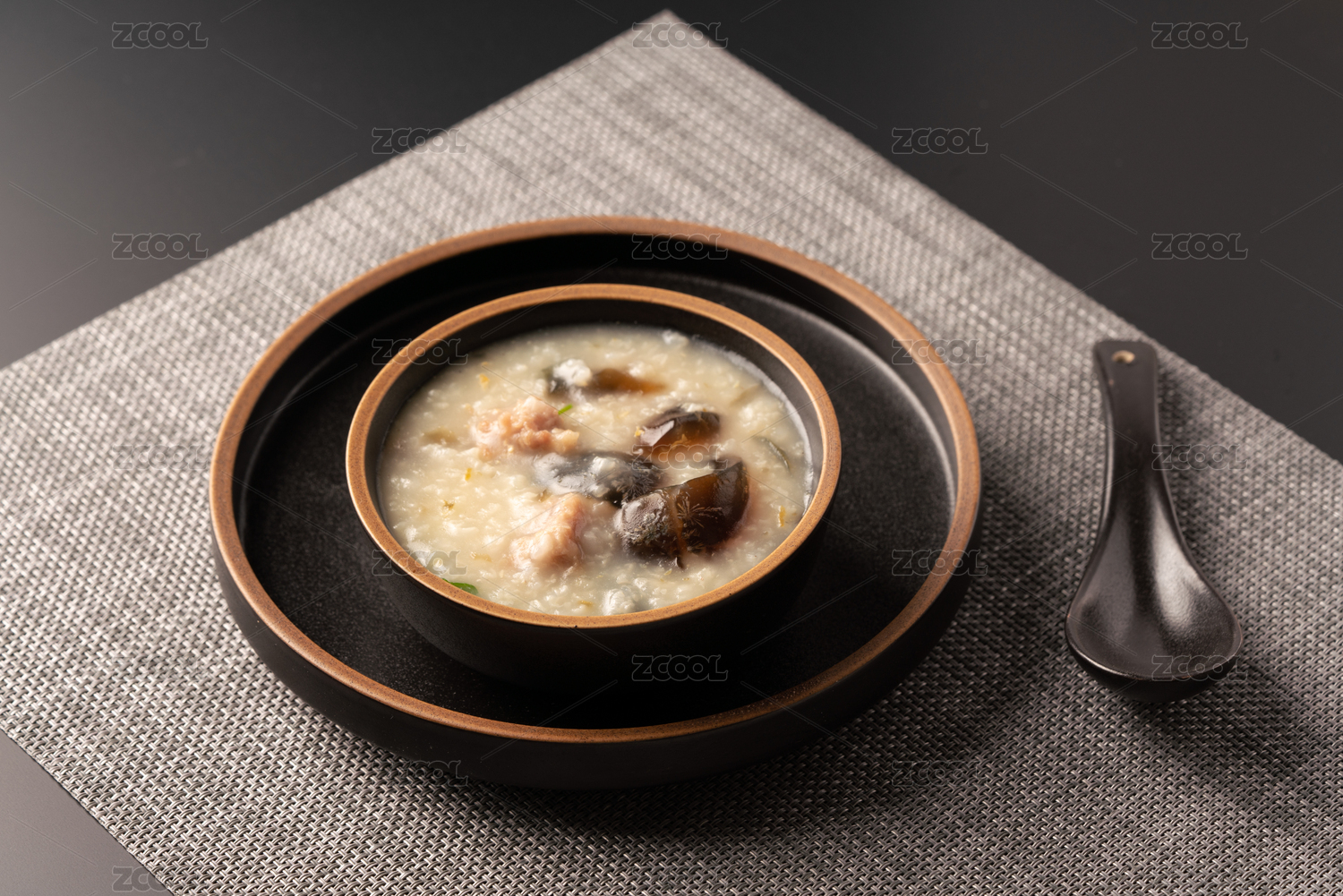 黑色反光桌面上的餐垫,碗托,勺子,和一碗皮蛋瘦肉粥 留白
