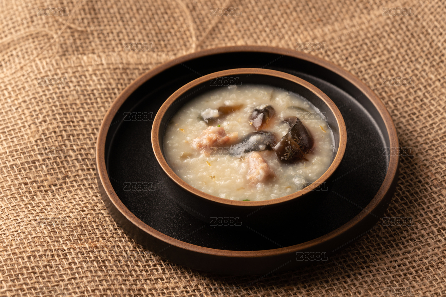 粗麻布上的托盘,和托盘上的皮蛋瘦肉粥