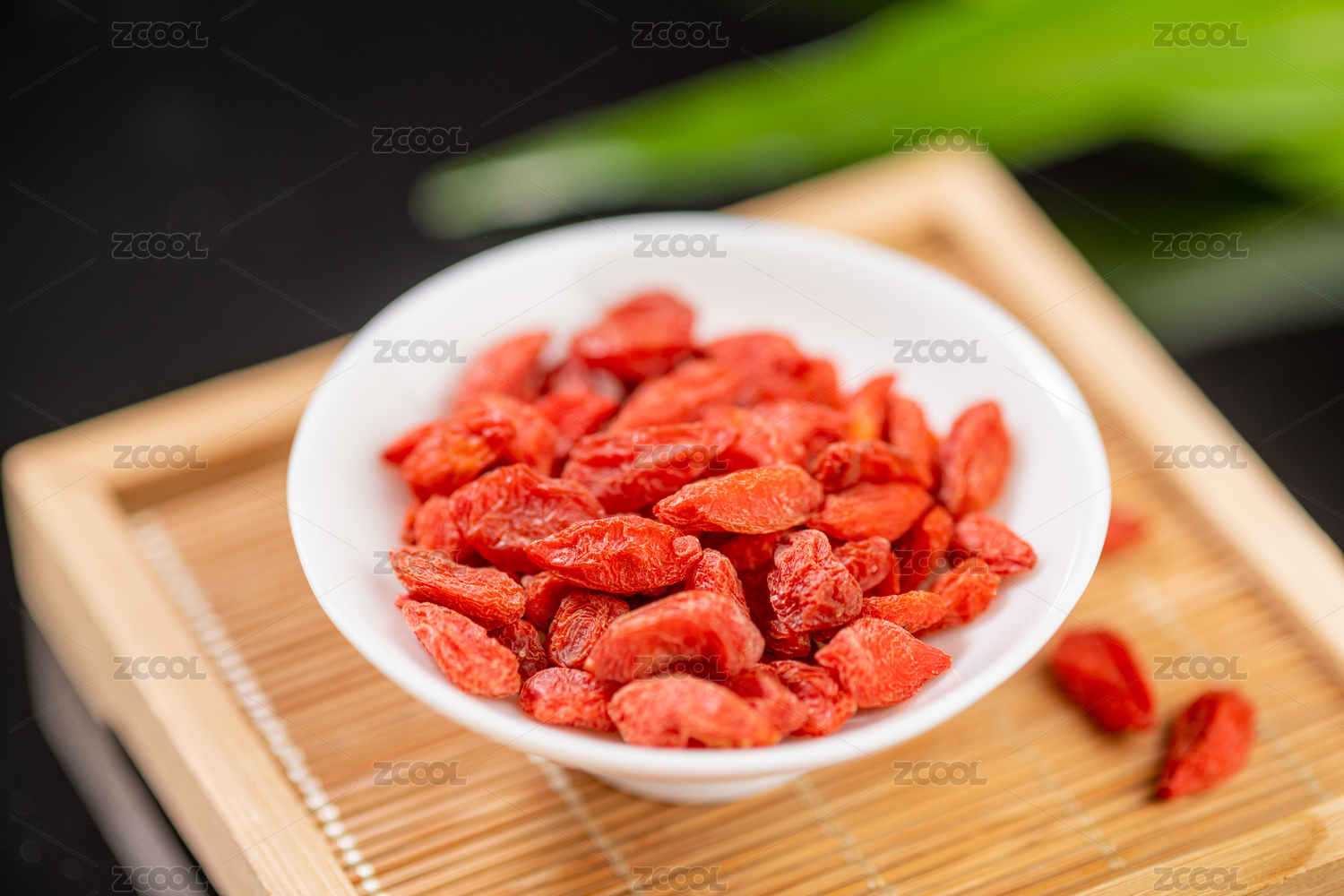 装有中式药材枸杞子的白瓷碟放在木盘里