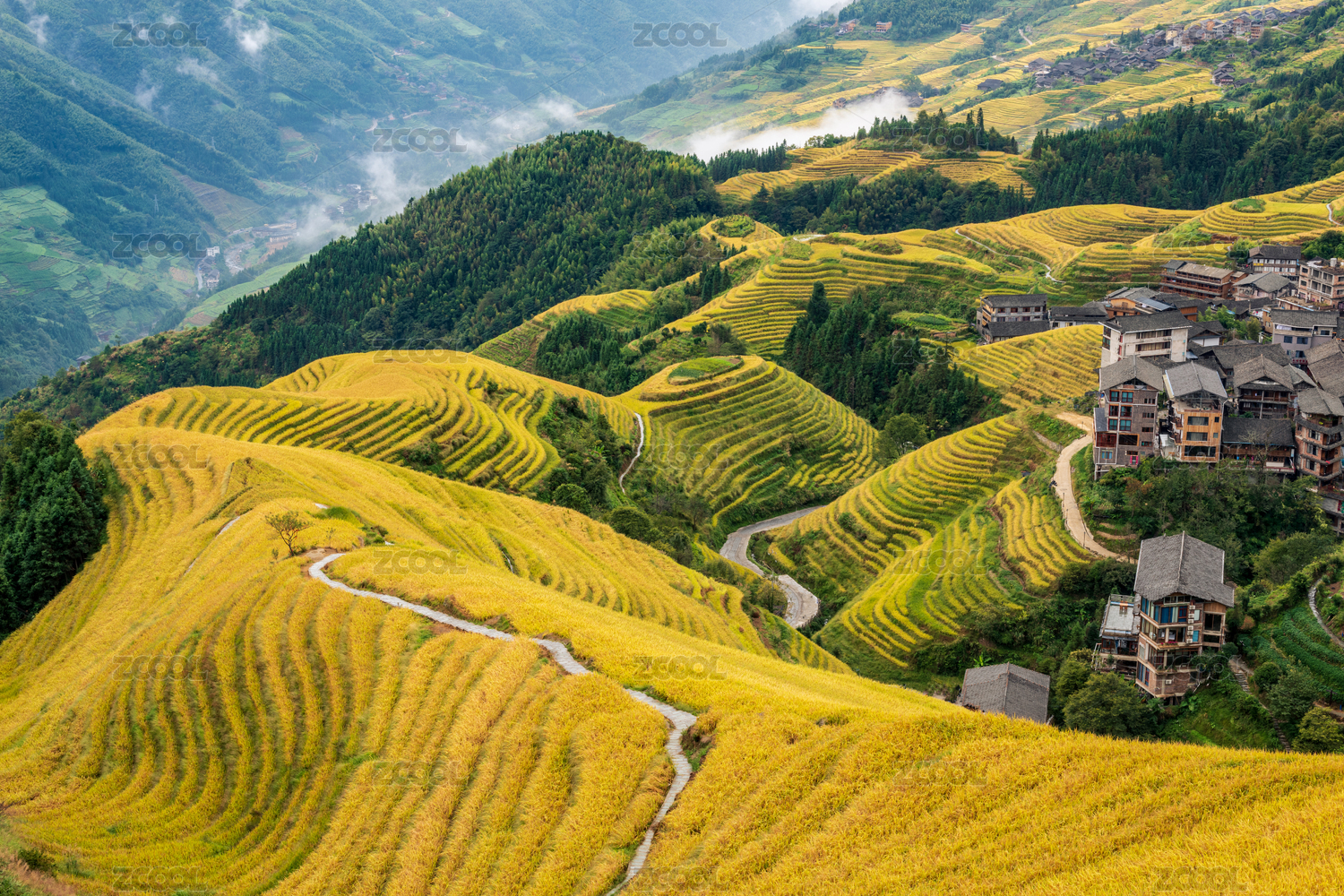 中国广西桂林龙胜县龙脊梯田稻谷黄了