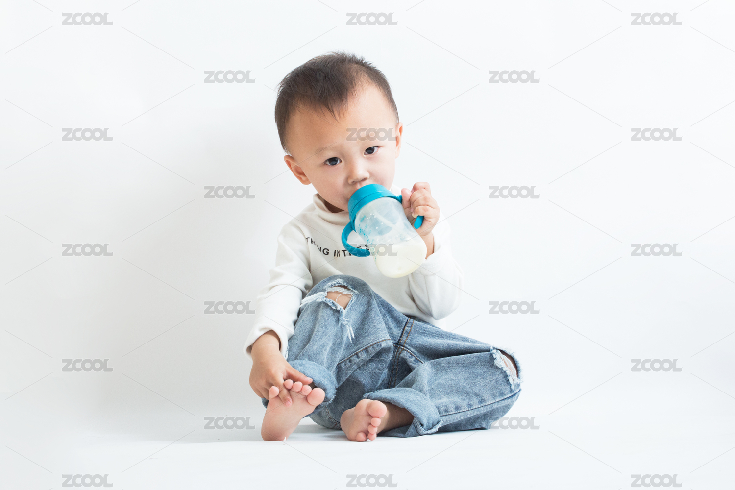 亚洲宝宝坐着手握奶瓶认真喝奶的白底图