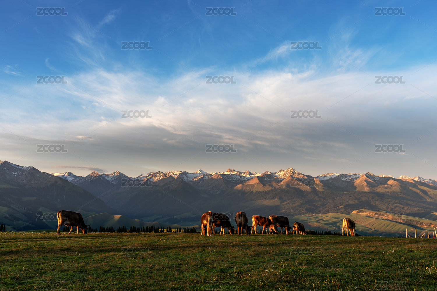 中国新疆那拉提空中草原雪山草地牛群风光