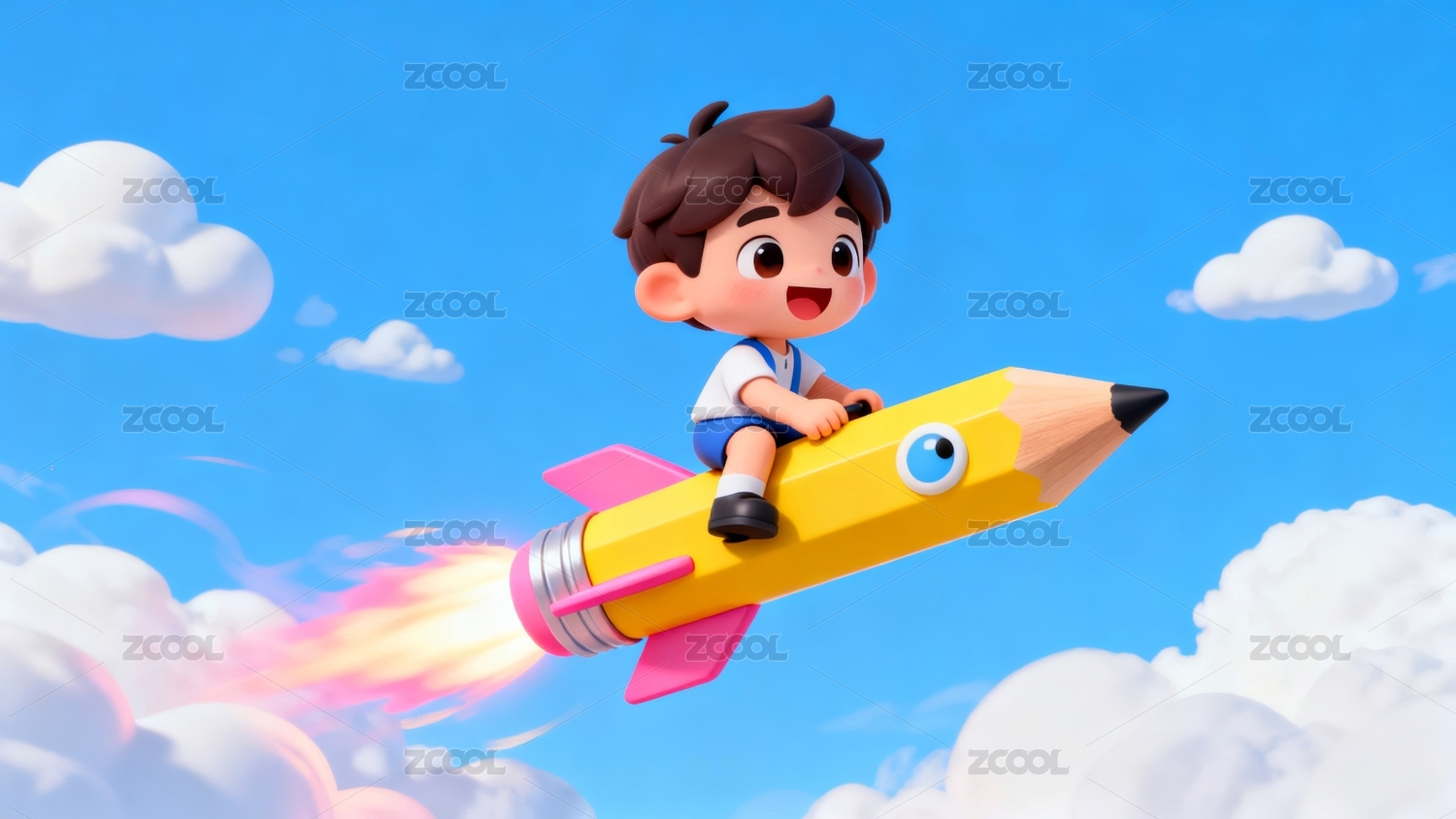 3D卡通 坐在铅笔上飞翔的男孩