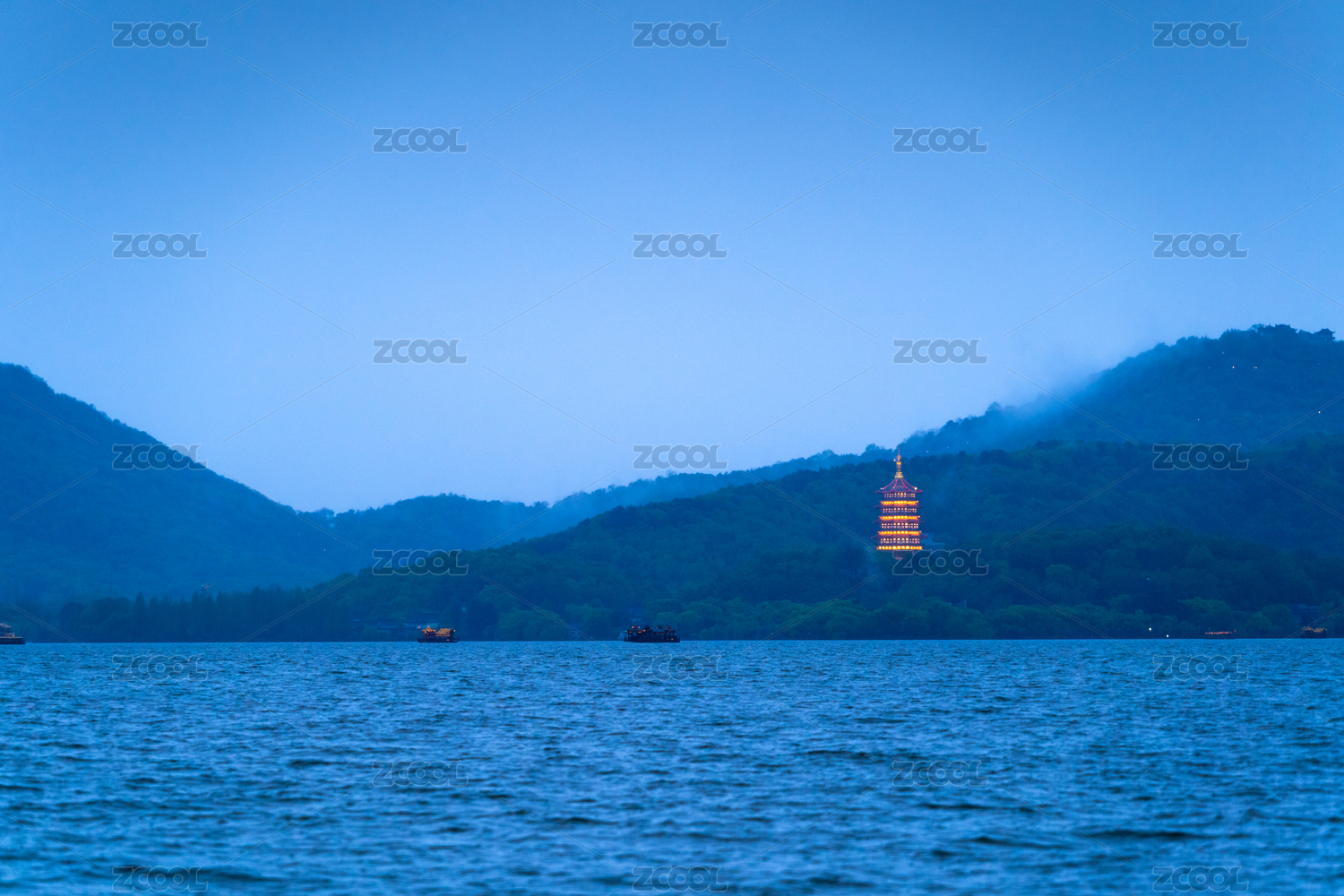 江南杭州西湖雷峰塔春天雷雨后傍晚蓝调风景