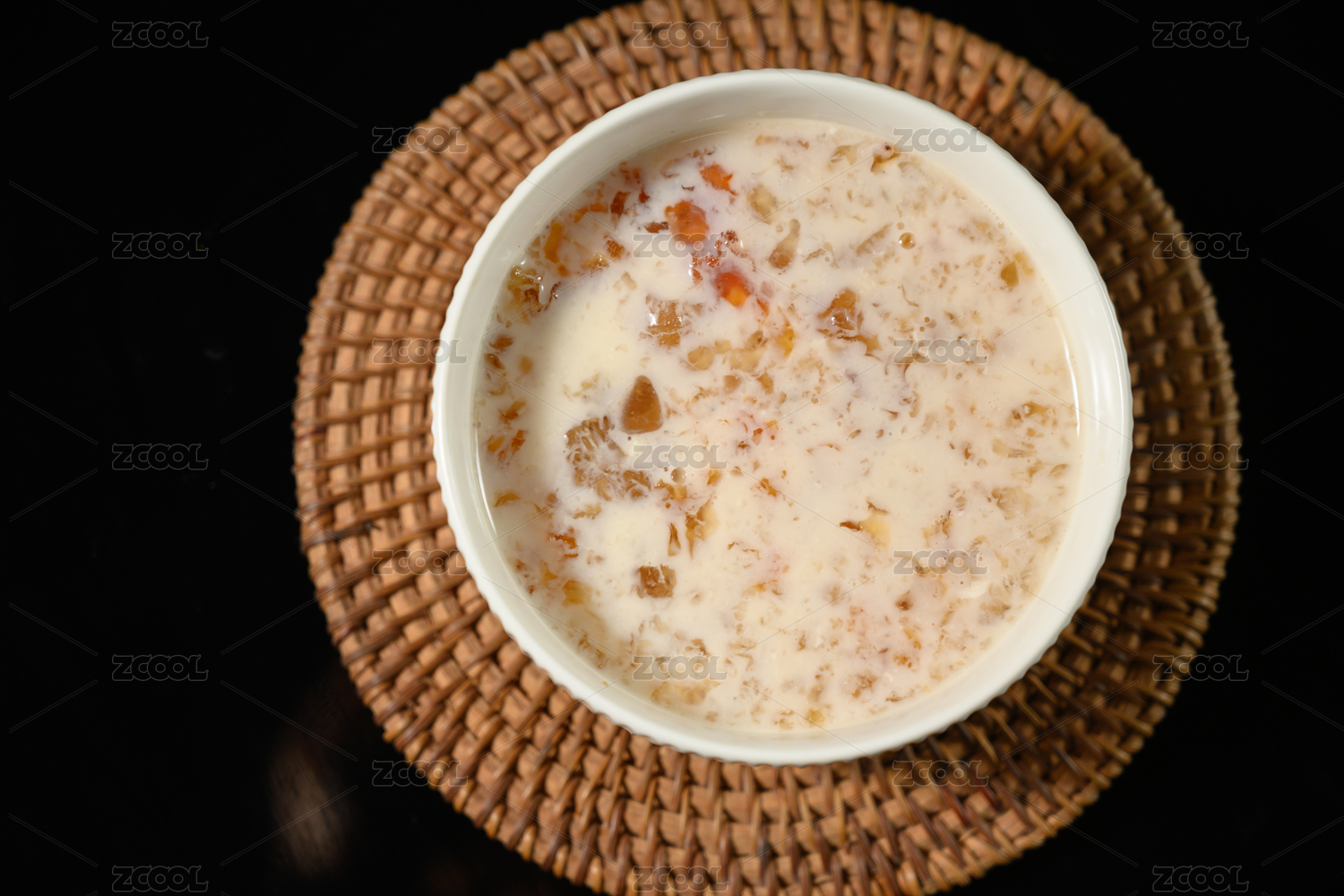 桌面上的碗里的美味可口的牛奶炖桃胶