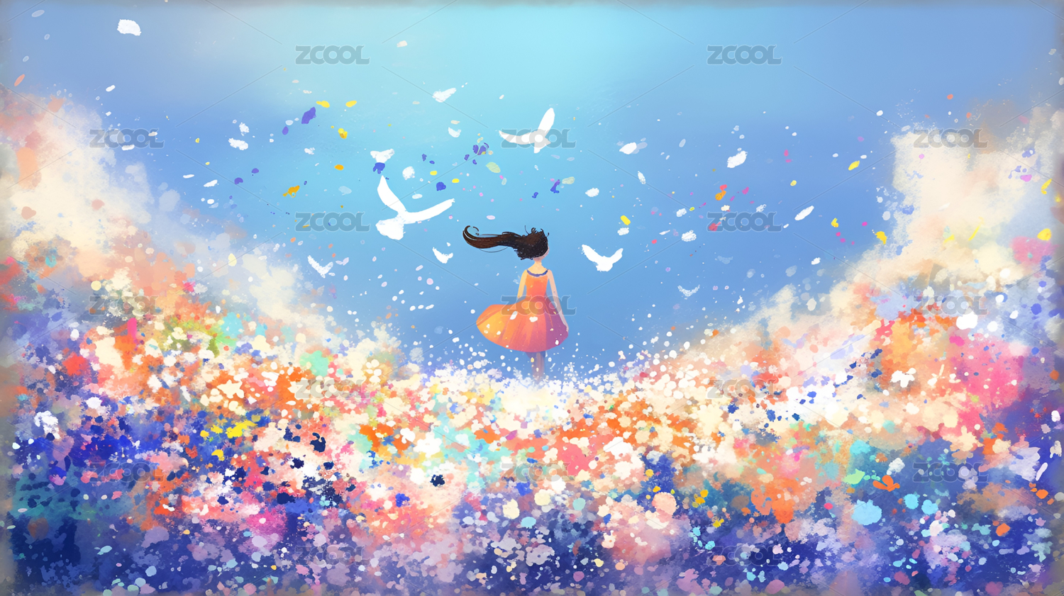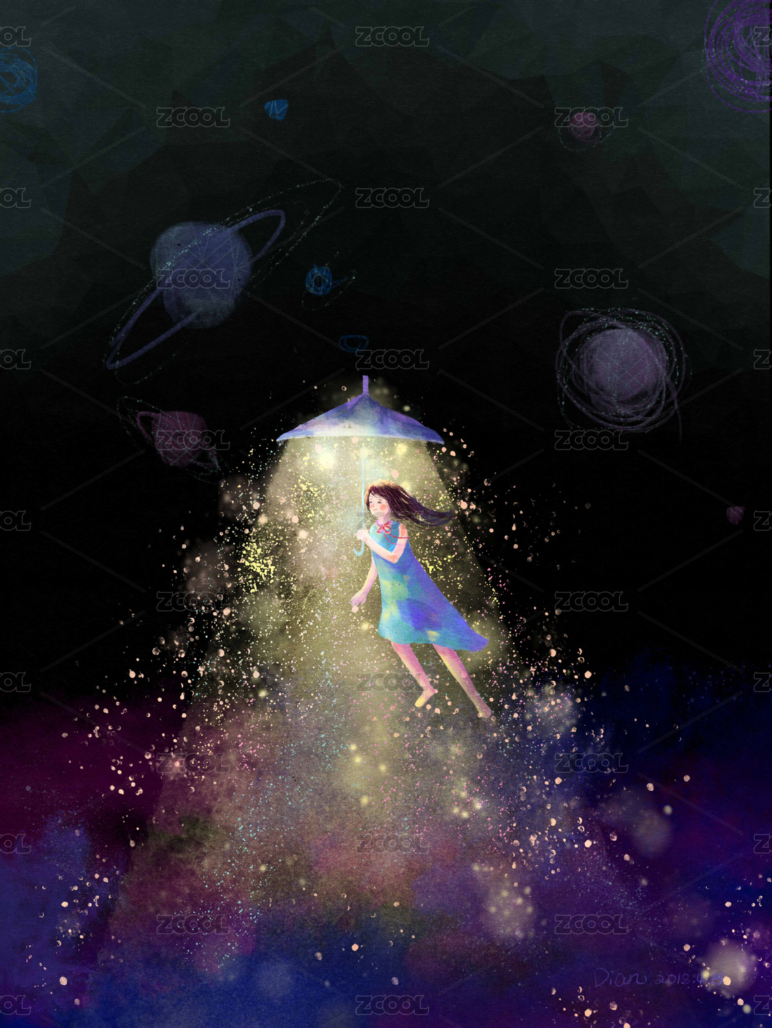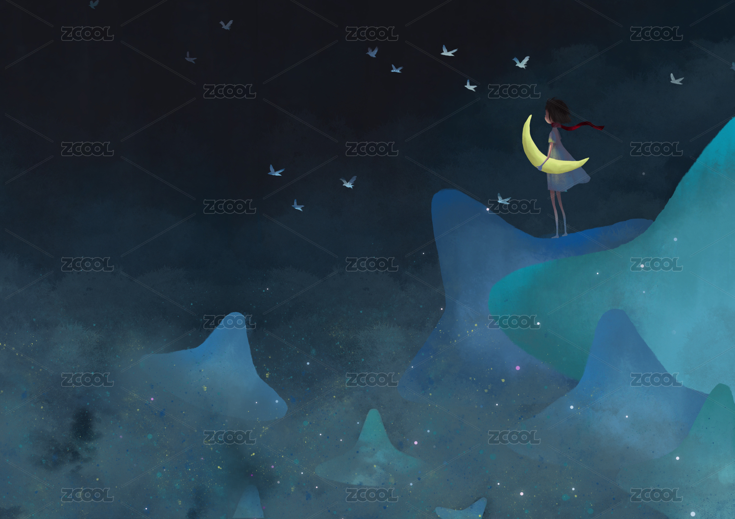 夜晚下在海边云朵下跳芭蕾舞飘带飞鸟的少女