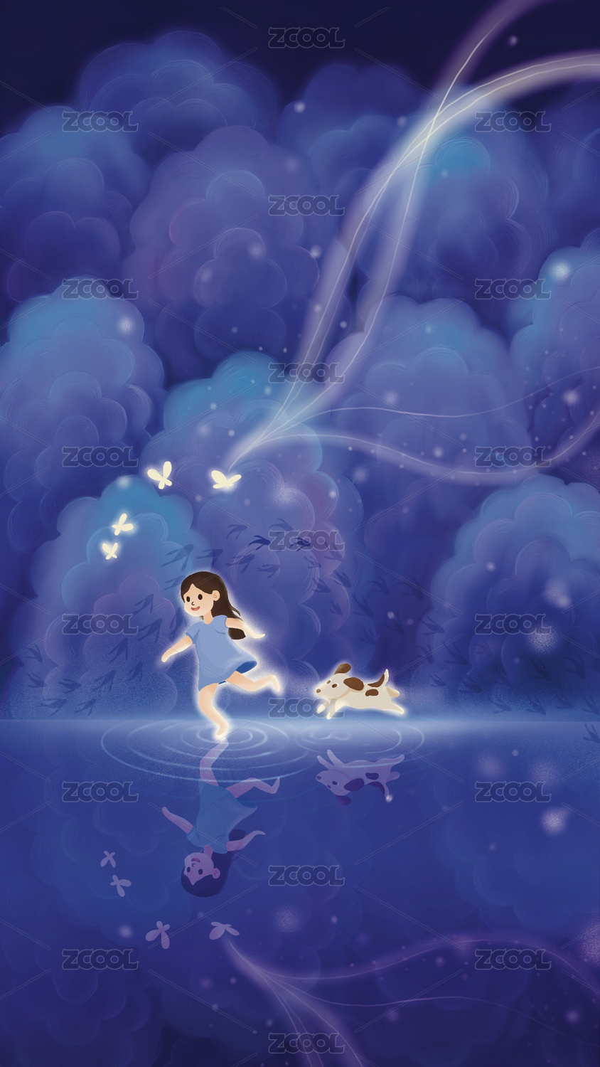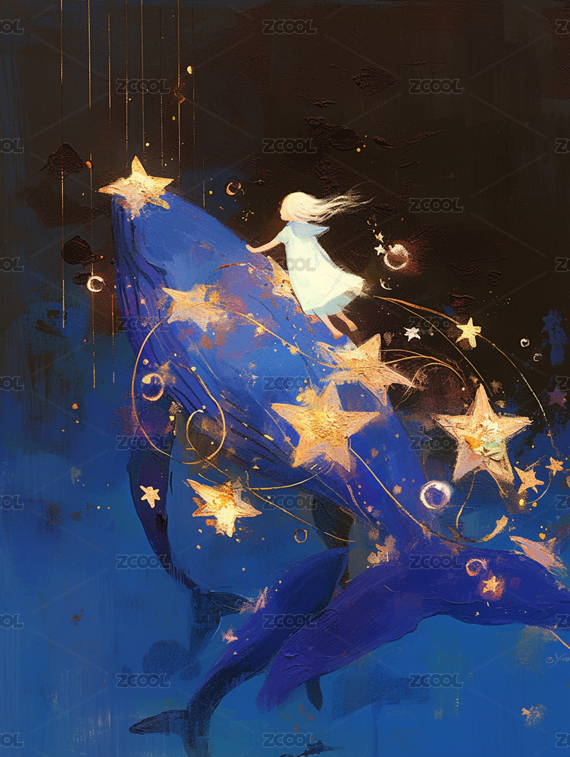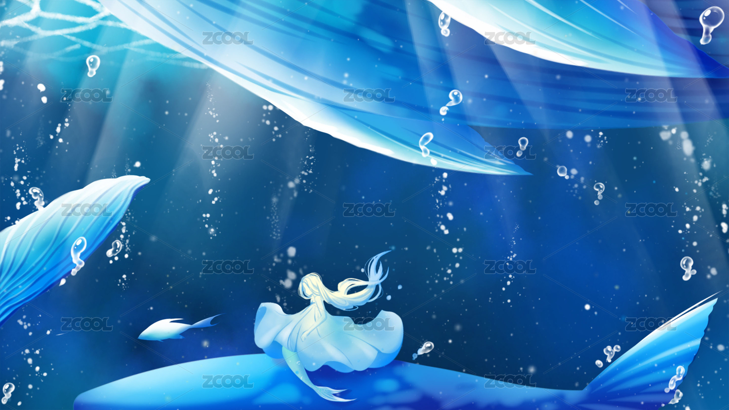 美人鱼与鲸鱼,深蓝色唯美卡通海洋插画