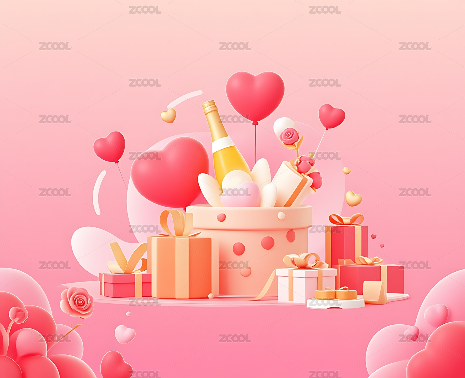 214,情人节,浪漫,粉红,电商,海报,场景,爱心,礼物,渐变