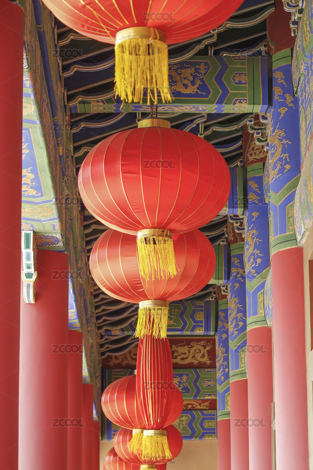 中式斗拱木结构建筑下挂着的一排红灯笼