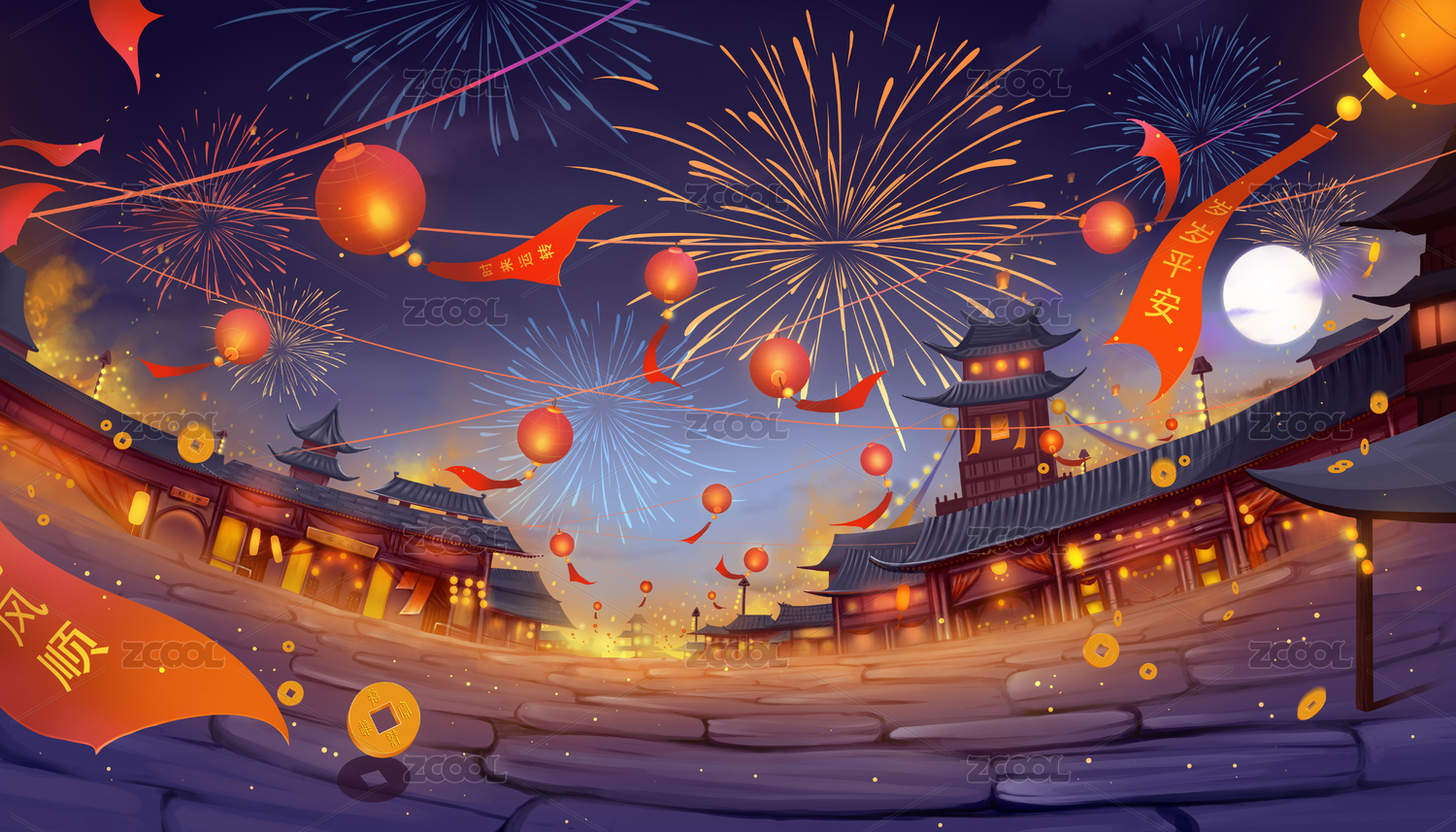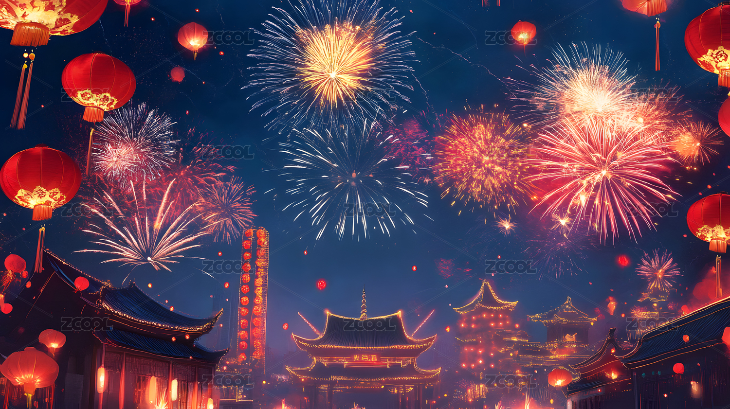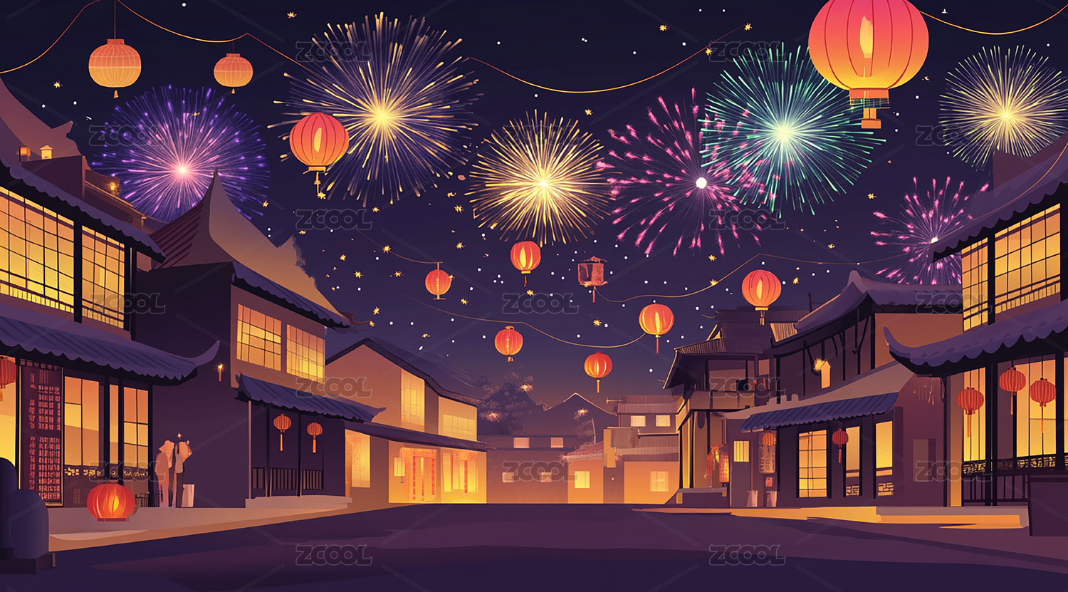 古风,元宵,春节,孔明灯,烟花,烟火,夜晚,建筑,场景,插画