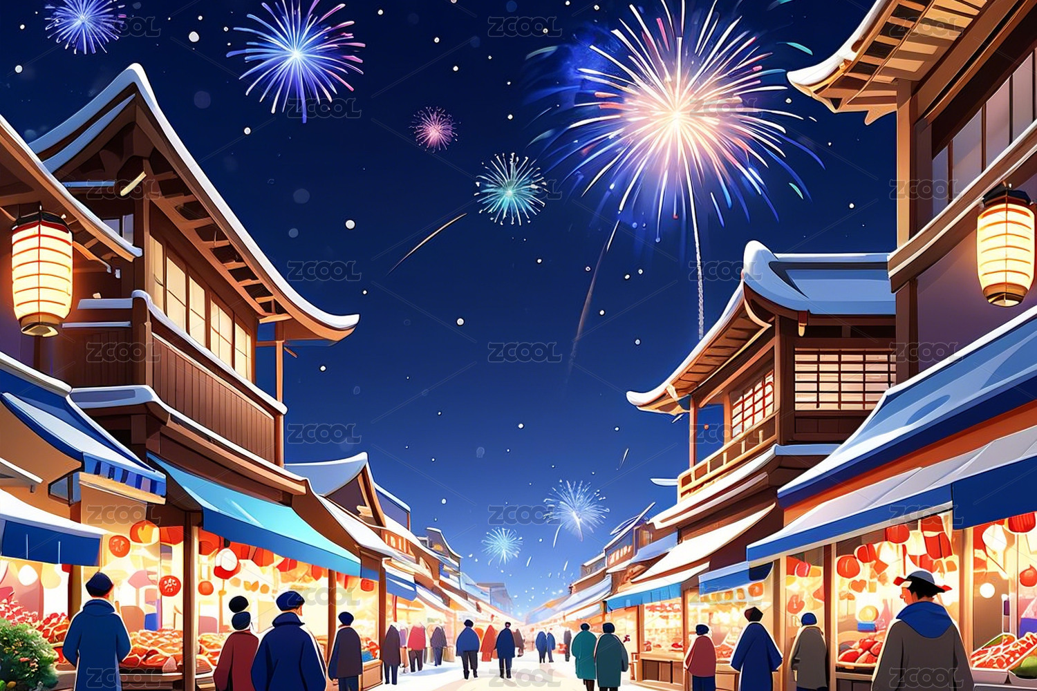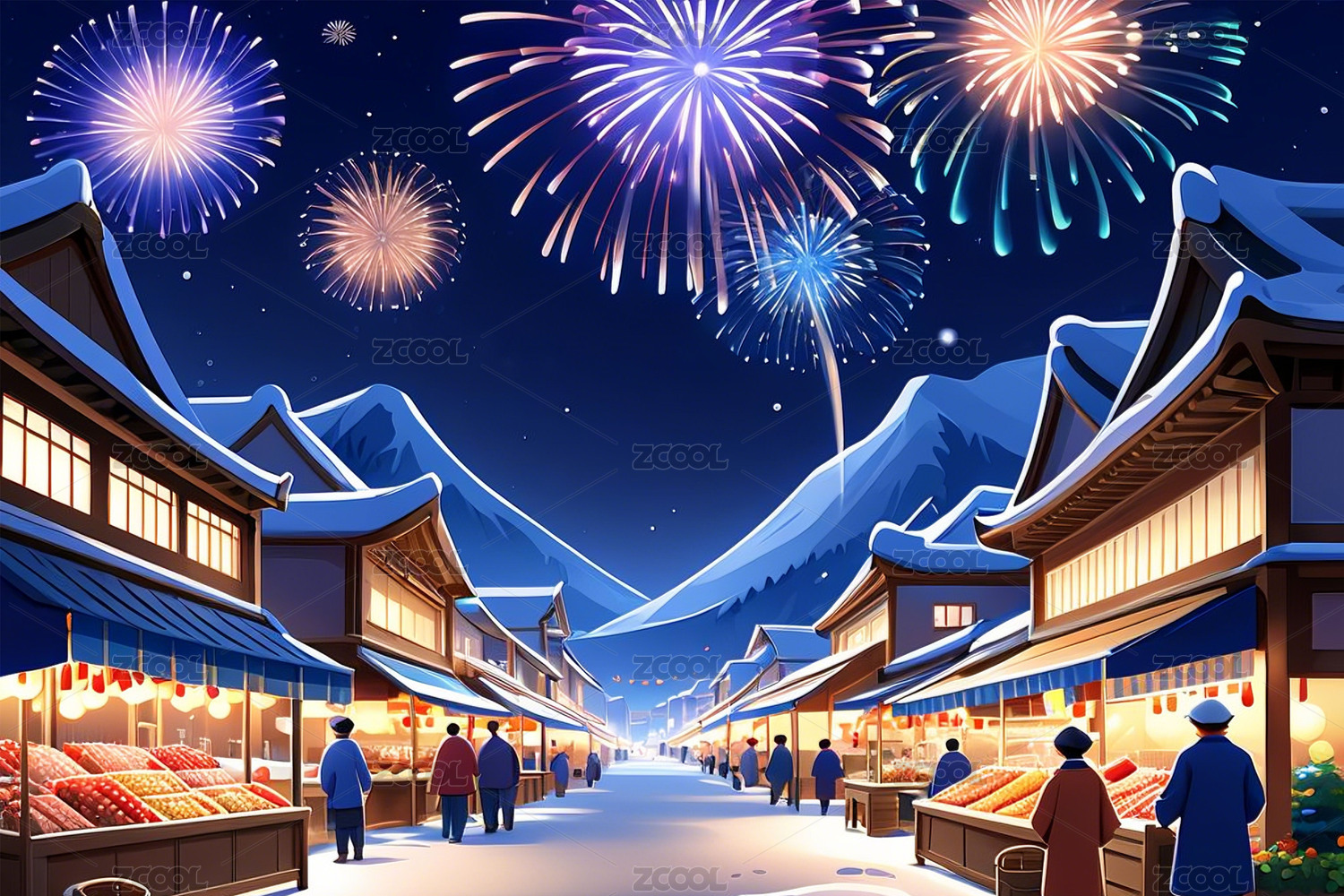烟花国庆节春节新年中秋节节日卡通插画背景