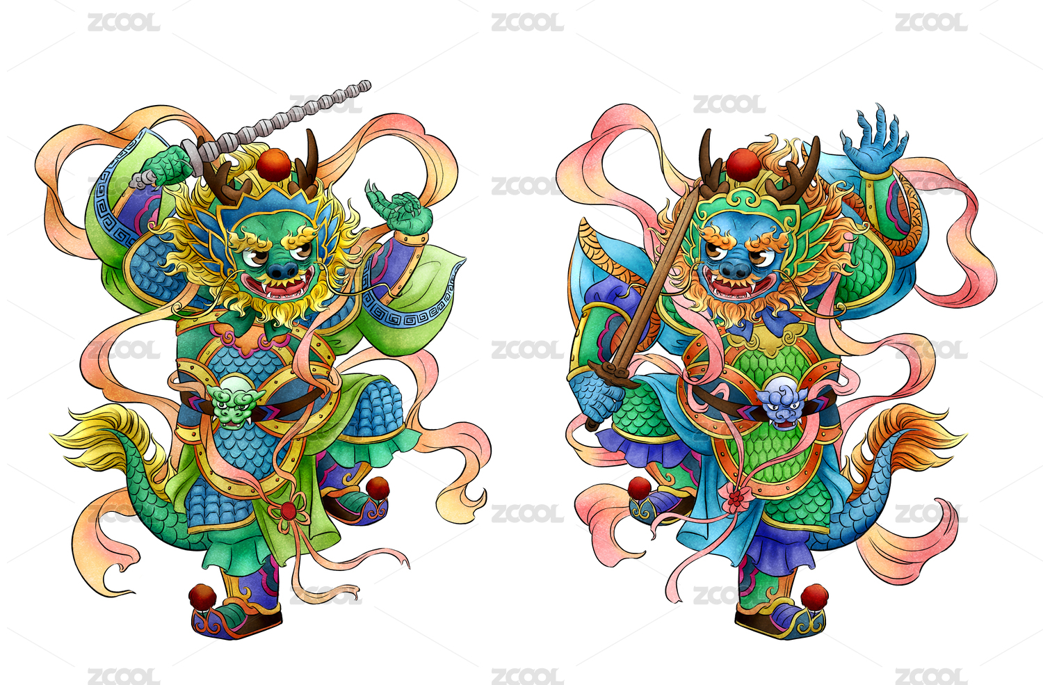 龙拟人门神一对白底