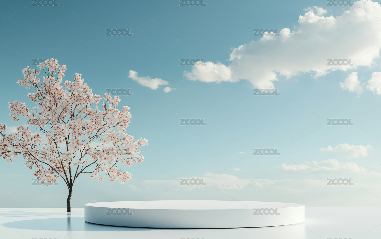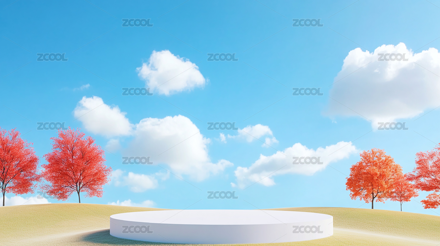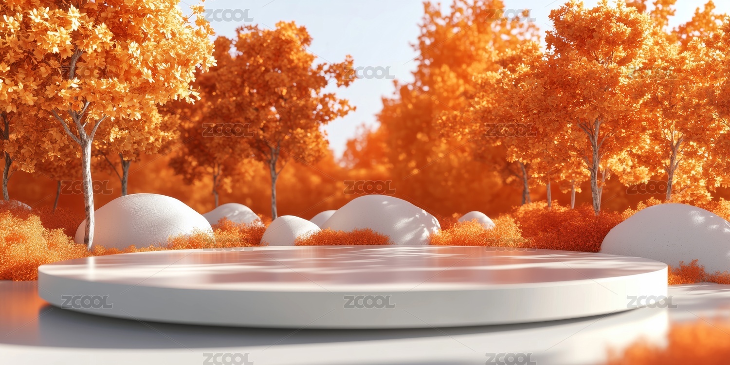 秋天金黄色树木掩映下白色圆形展台3D场景