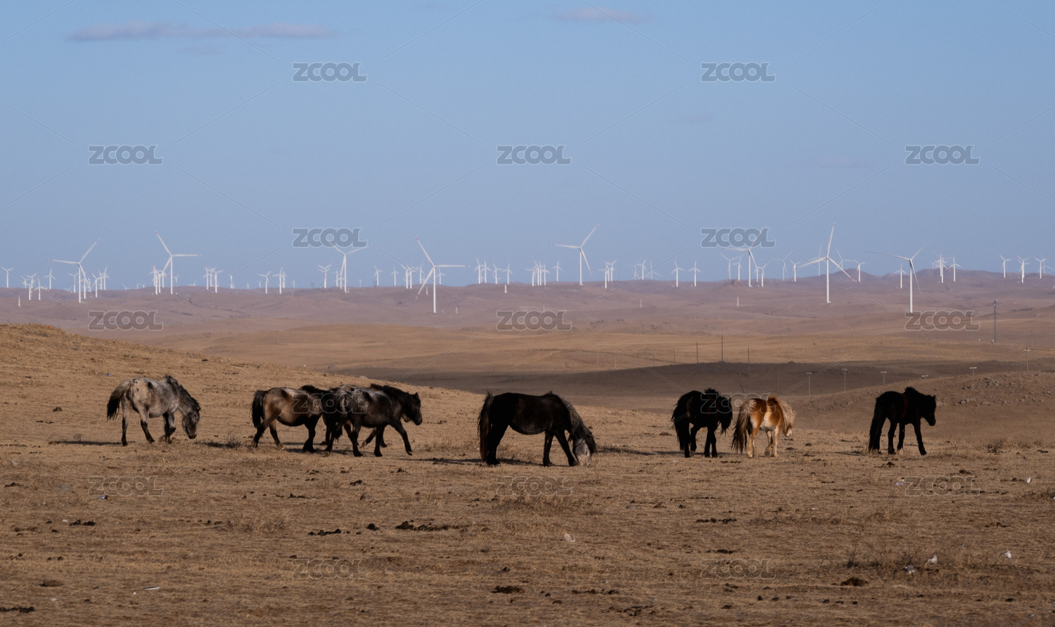 初冬季节内蒙古锡林郭勒牧区草原上吃草的马群