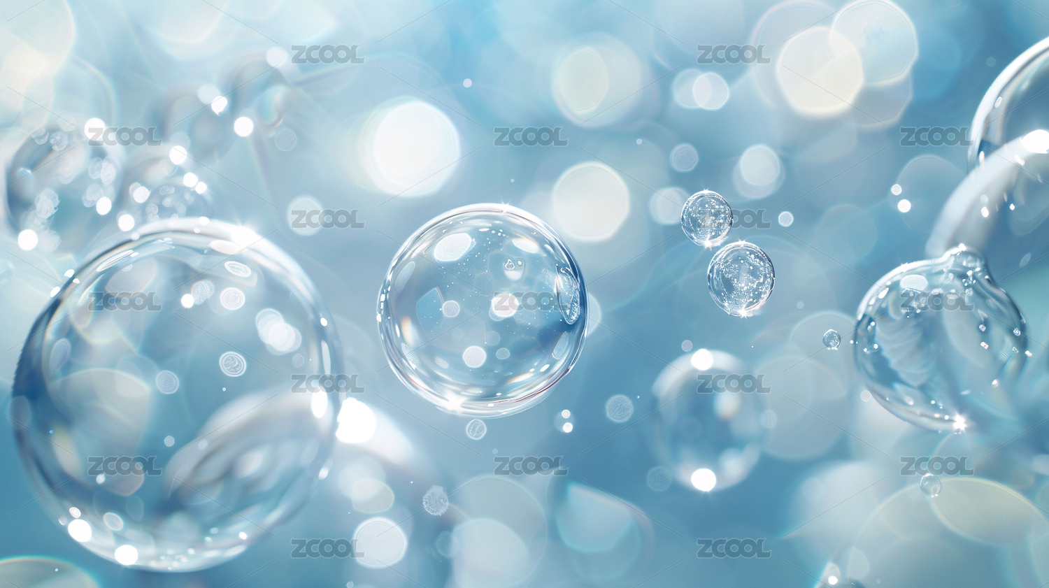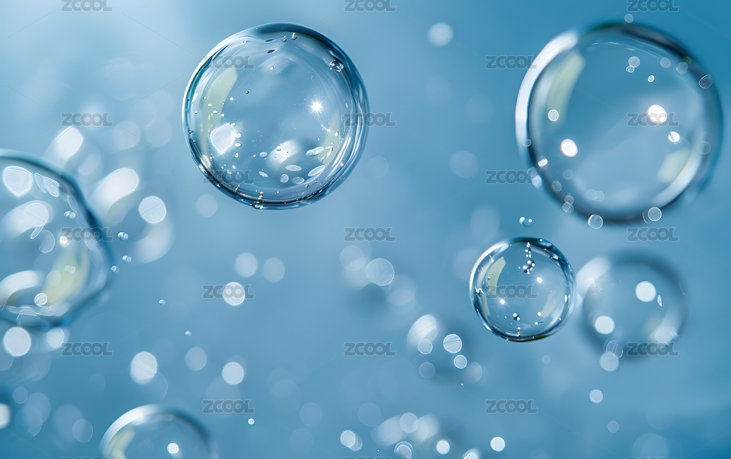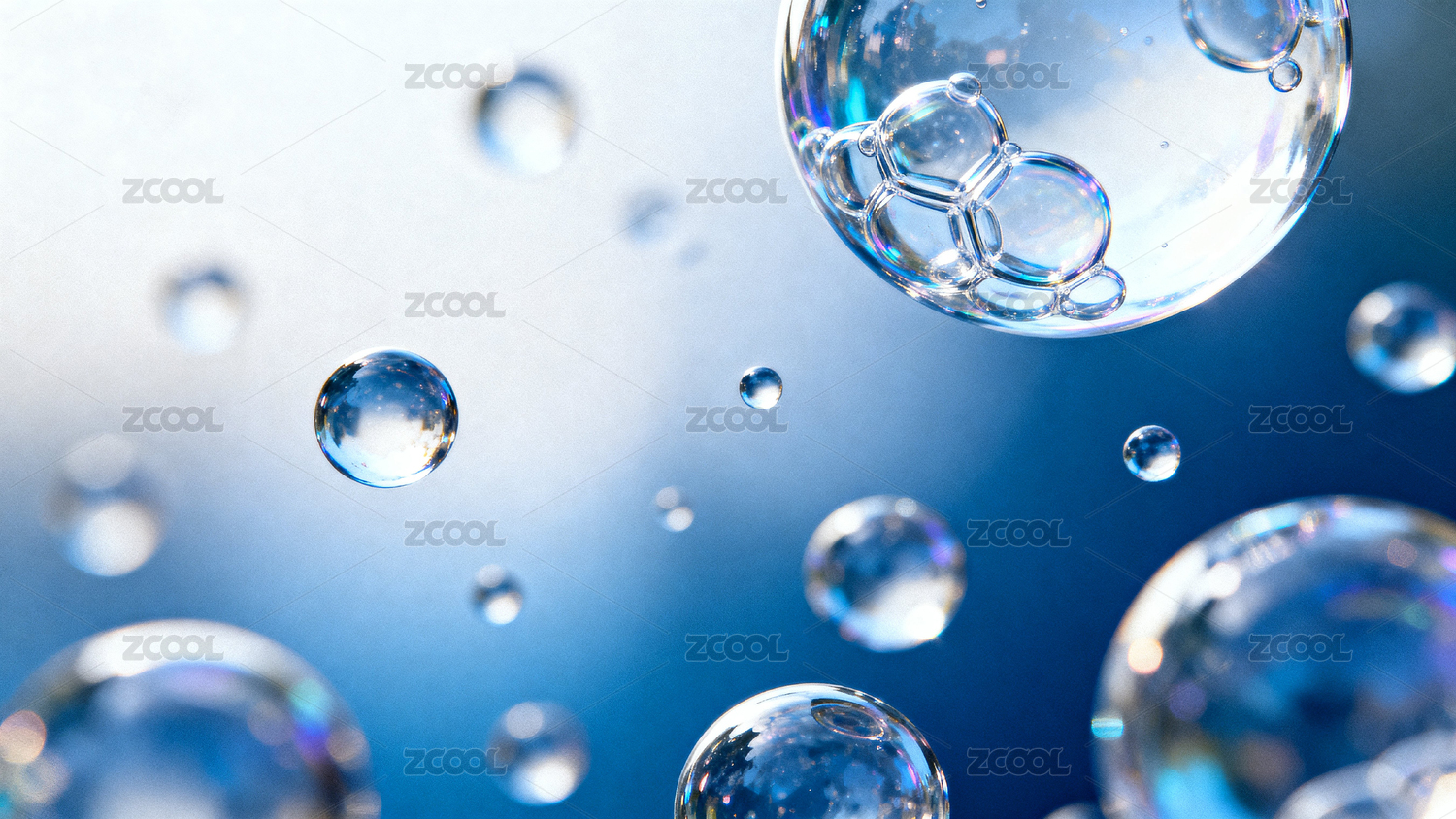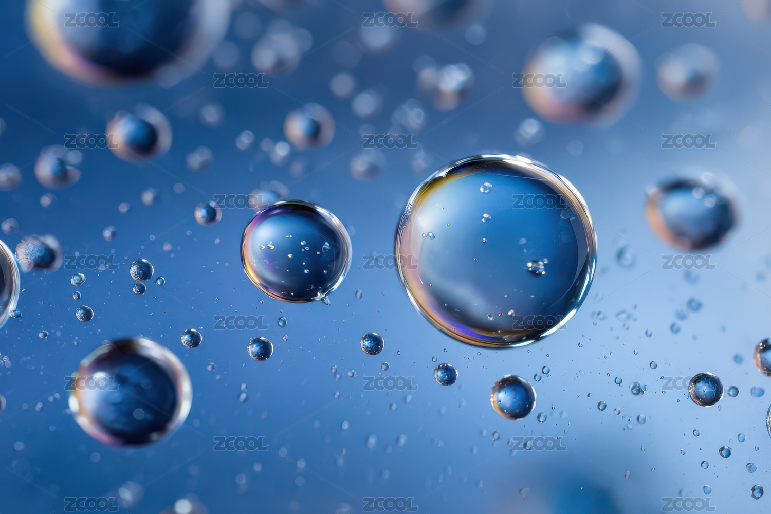 晶莹水珠悬浮于淡蓝背景的梦幻场景