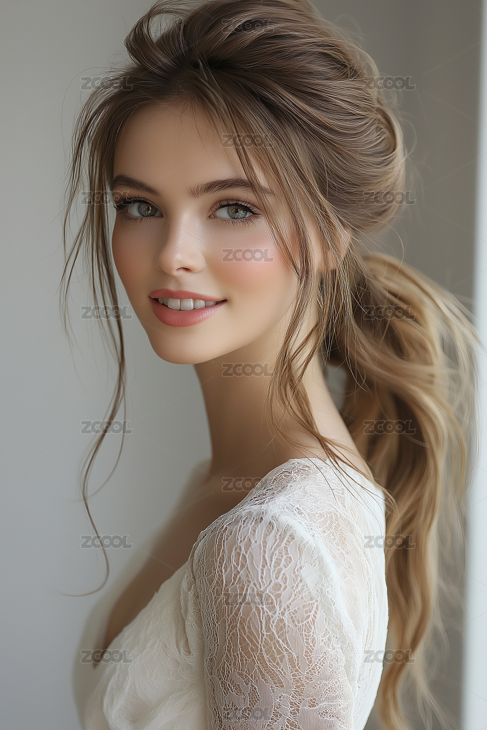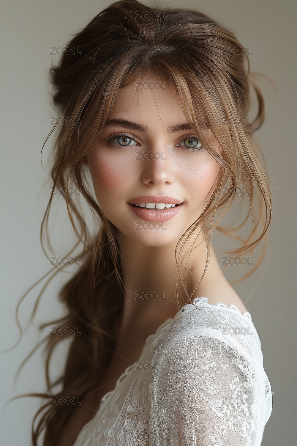 一位棕发美人侧身回眸,肌肤白皙,眼神清澈