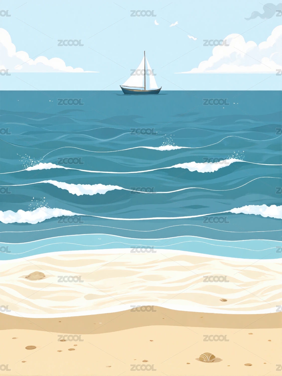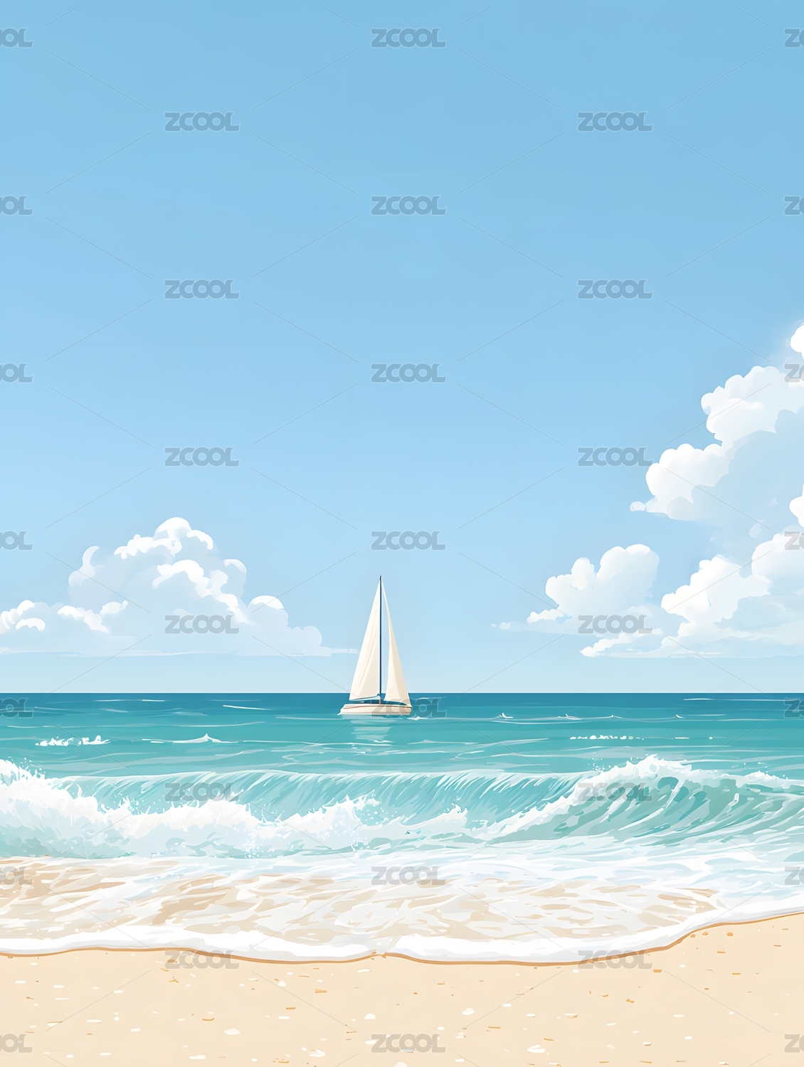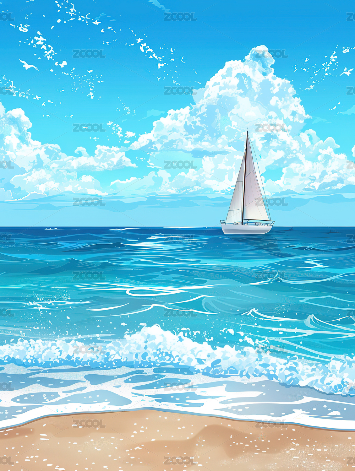卡通风格蓝天白云大海沙滩背景下的一艘帆船