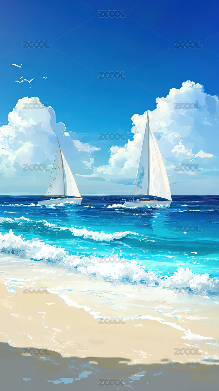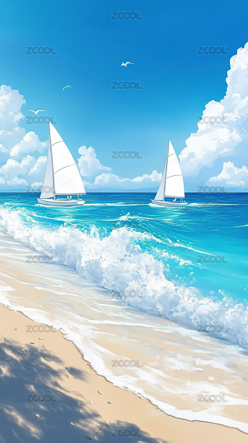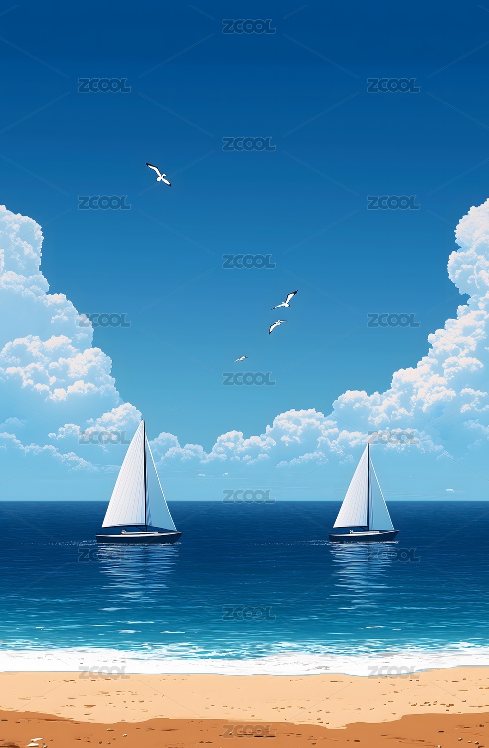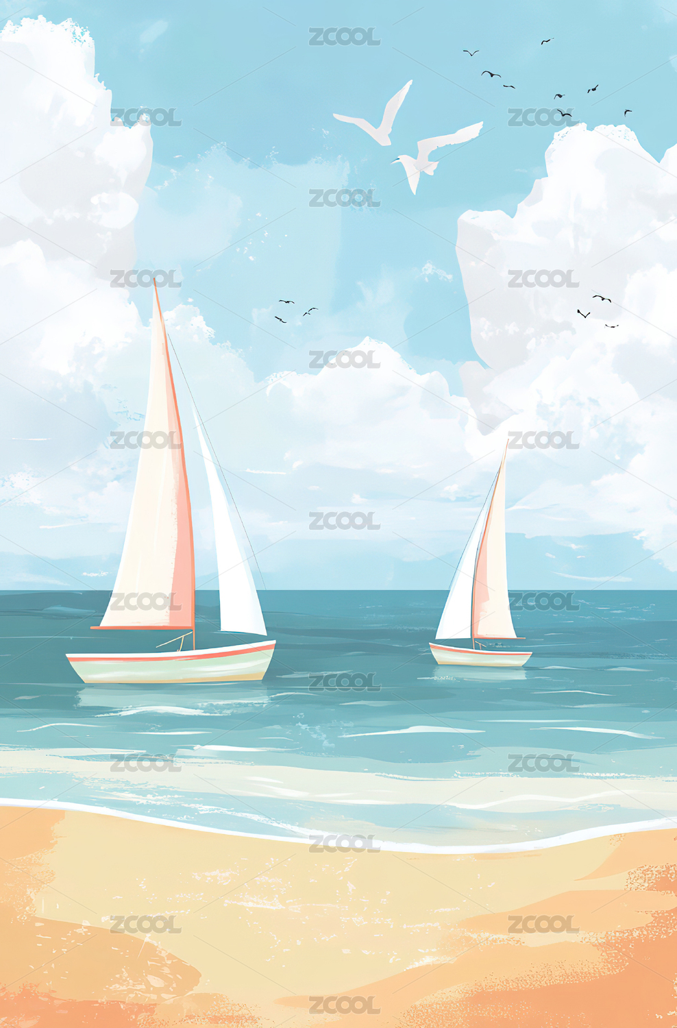 卡通风格蓝天白云大海沙滩背景下的一艘帆船
